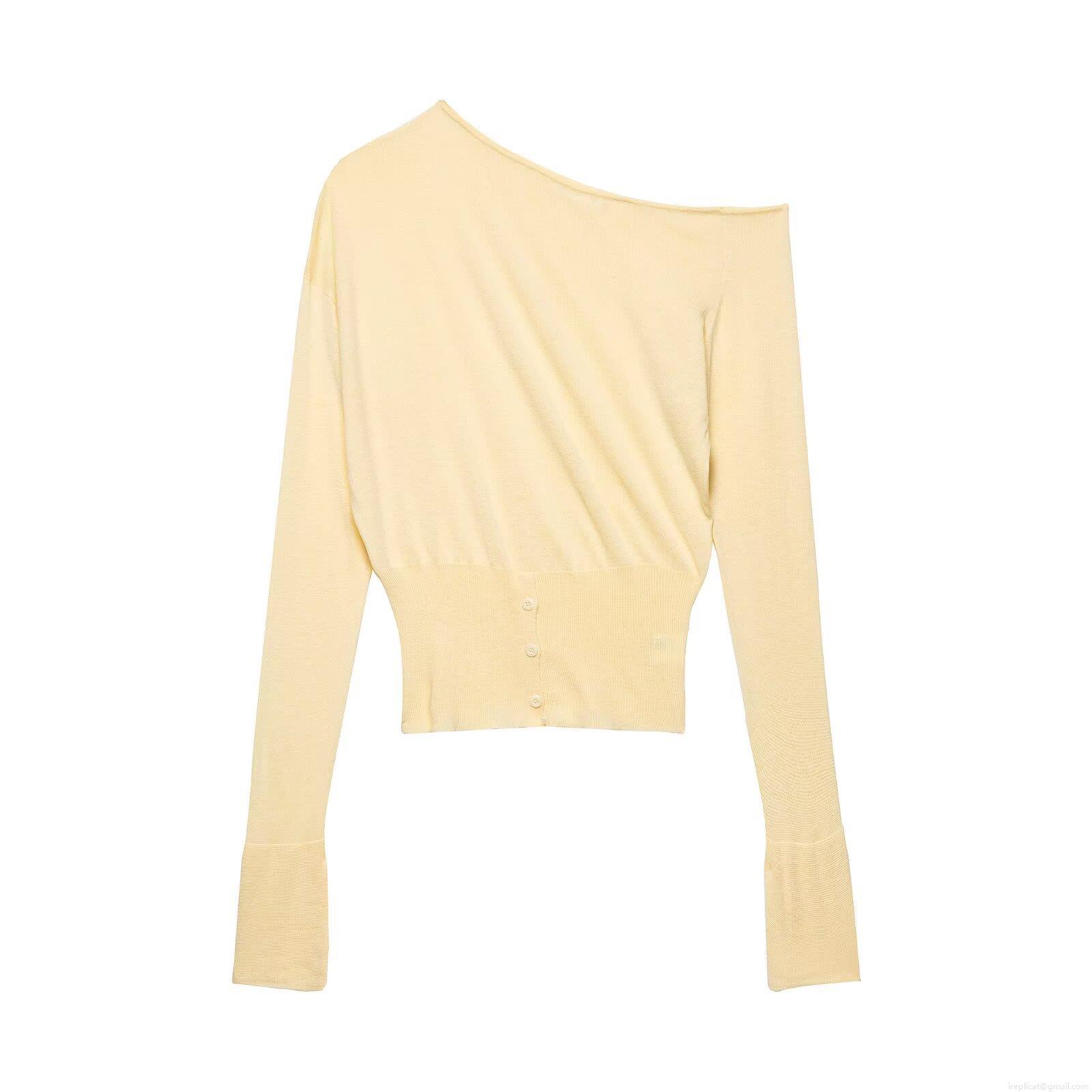 • Women's Off-Shoulder Knit Sweater Long Sleeve Slim Fit Pullover With Side Decorative Buttons Solid Color Polyester Fine Knit Top For Daily Outing