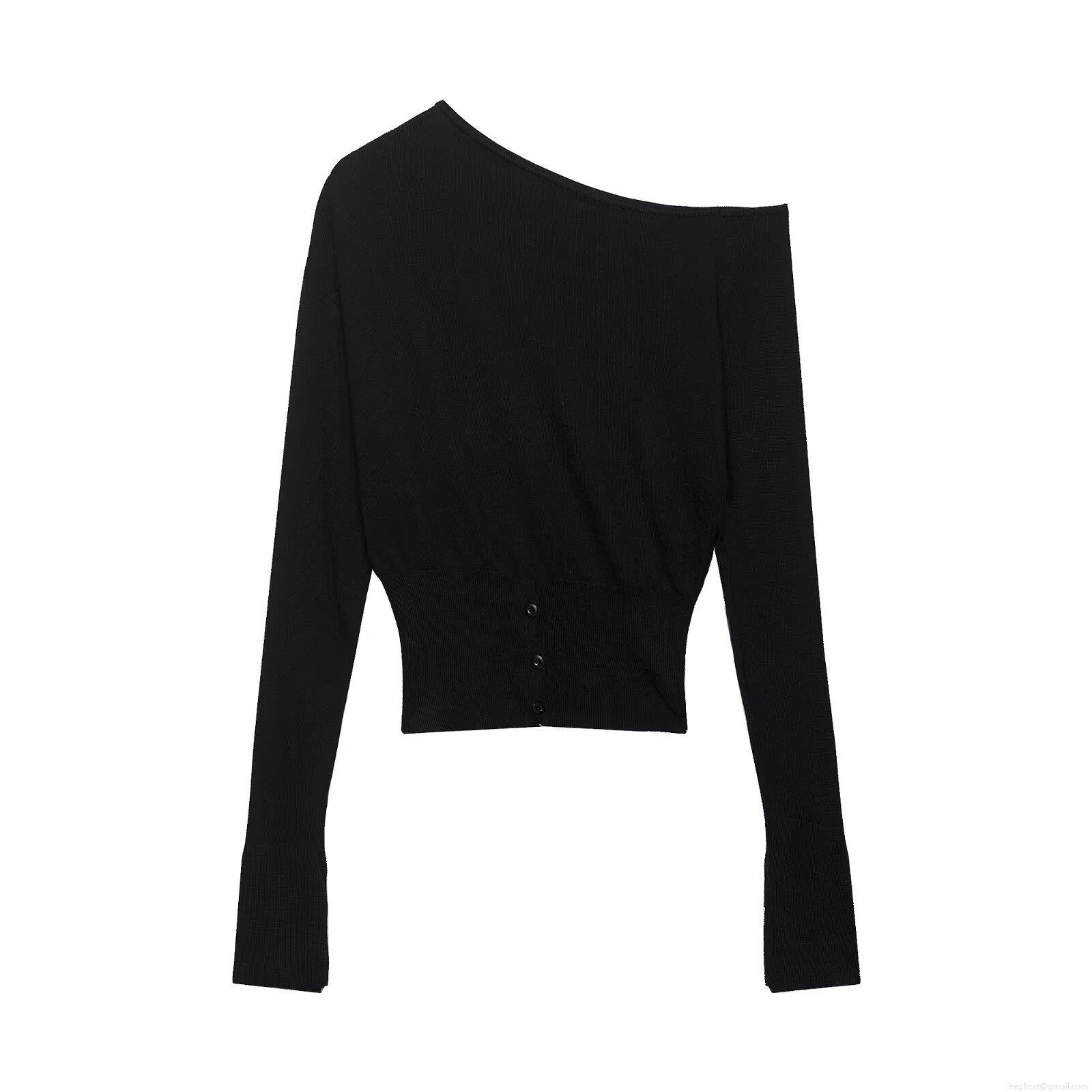Women's Off-Shoulder Knit Sweater Long Sleeve Slim Fit Pullover With Side Decorative Buttons Solid Color Polyester Fine Knit Top For Daily Outing