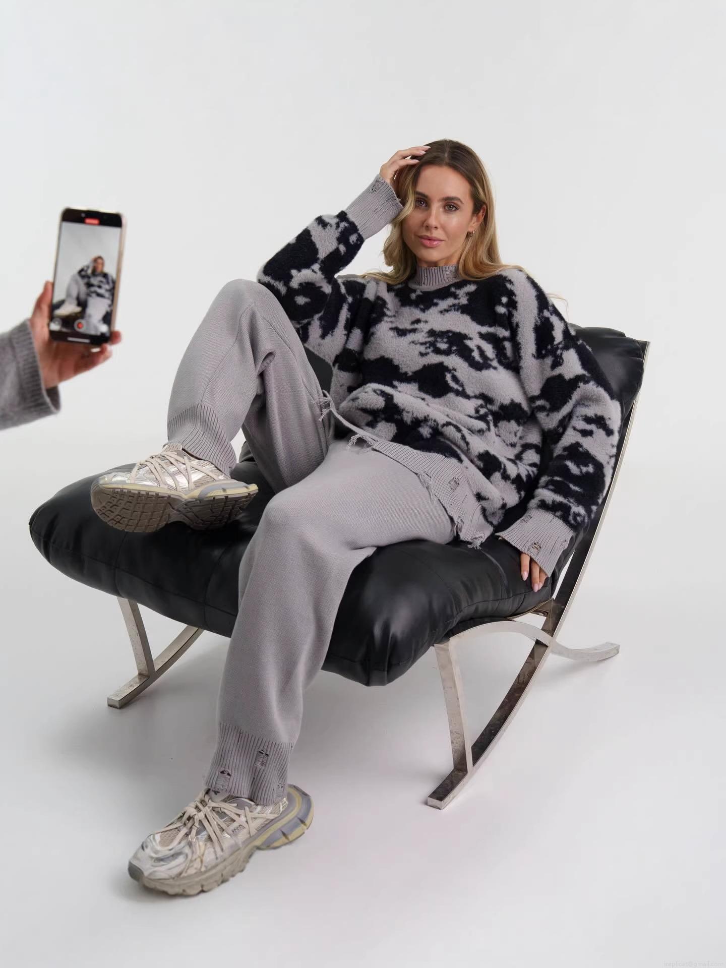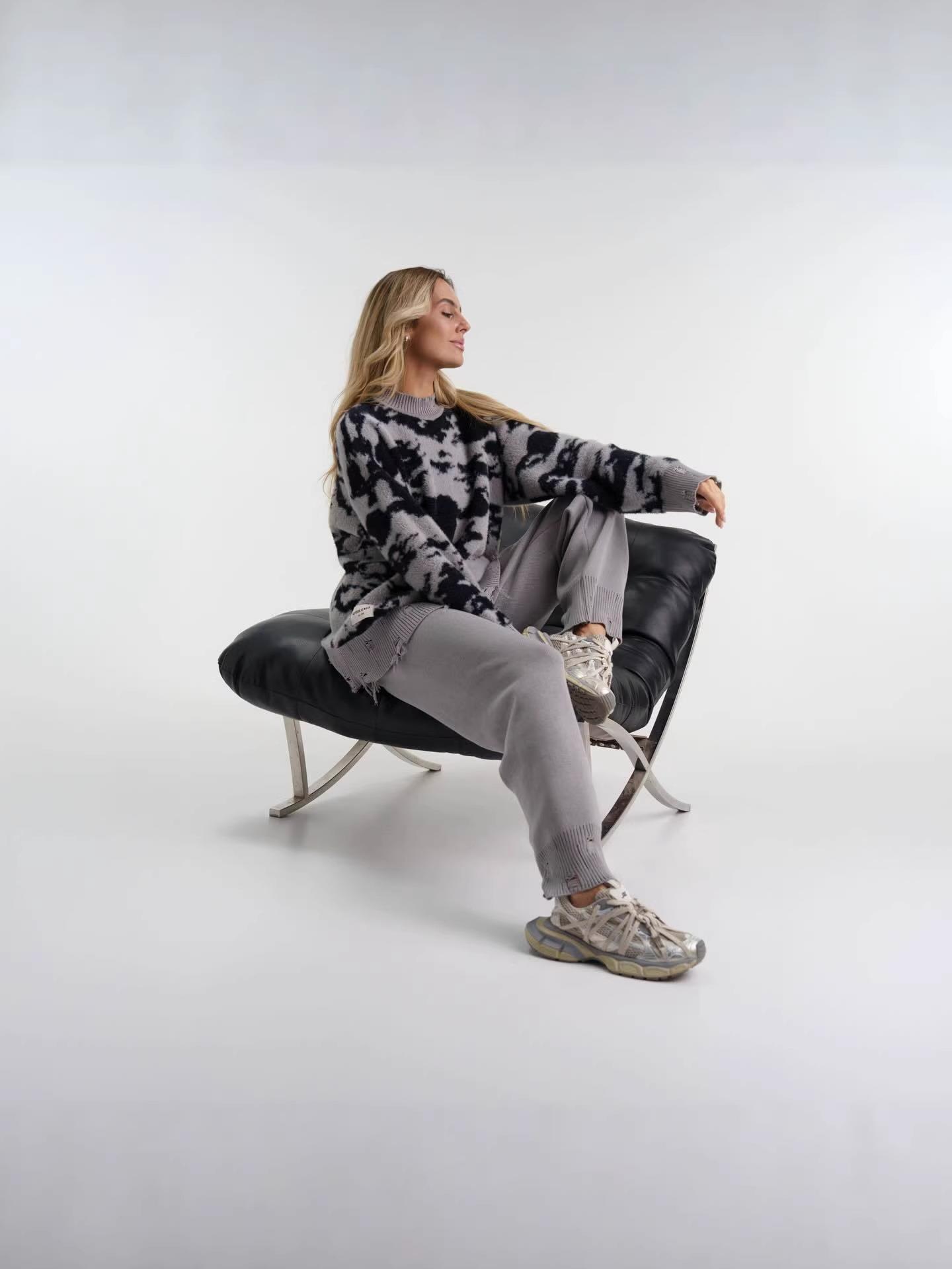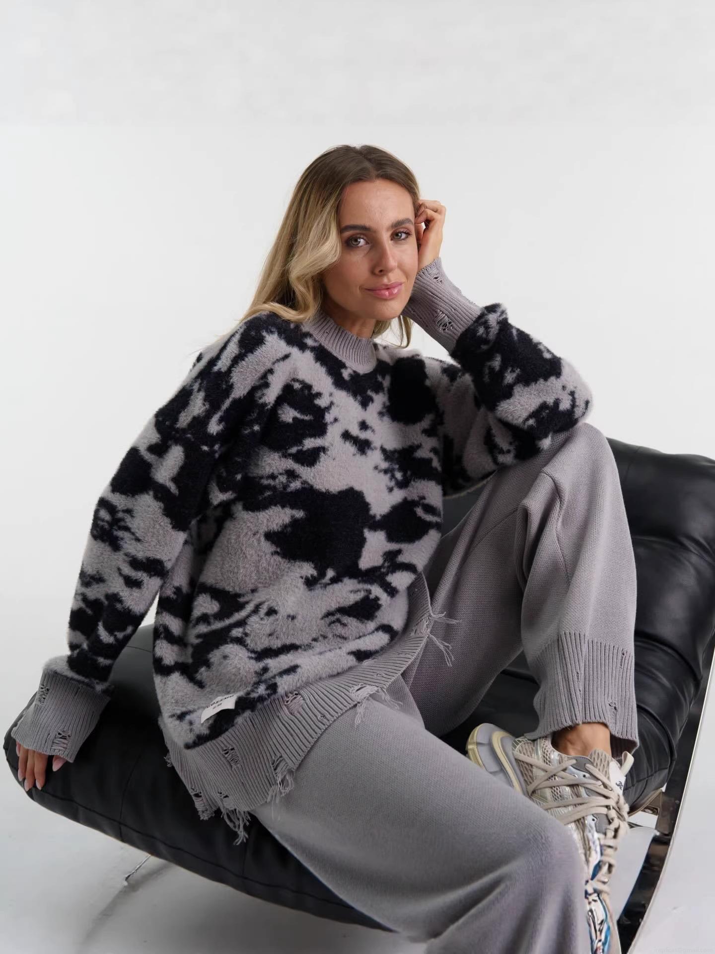 • Women's Oversized Distressed Knit Sweater Spliced Contrast Color Round Neck Cloud Pattern Pullover Long Sleeve Streetwear Jumper Top