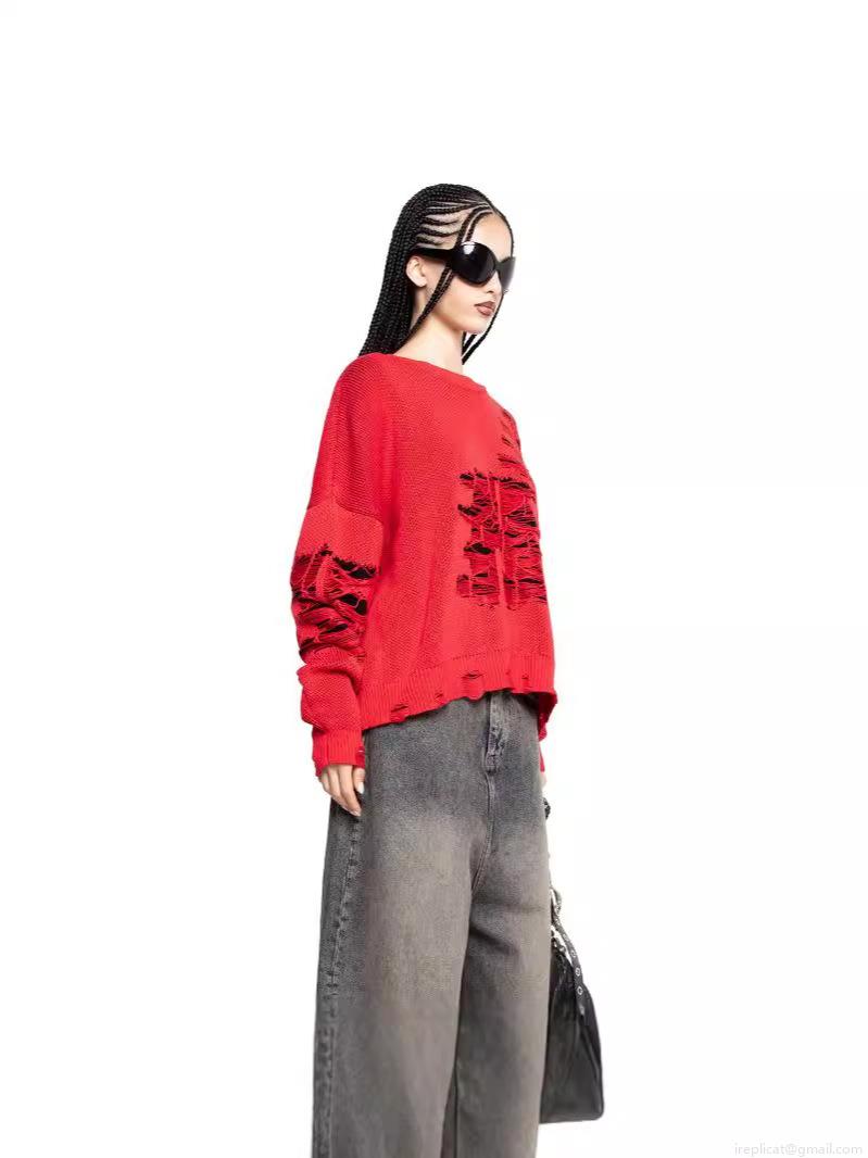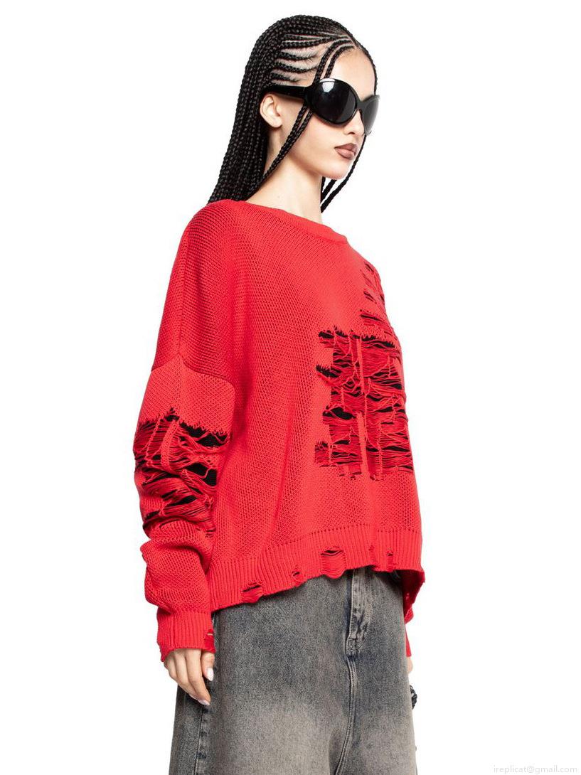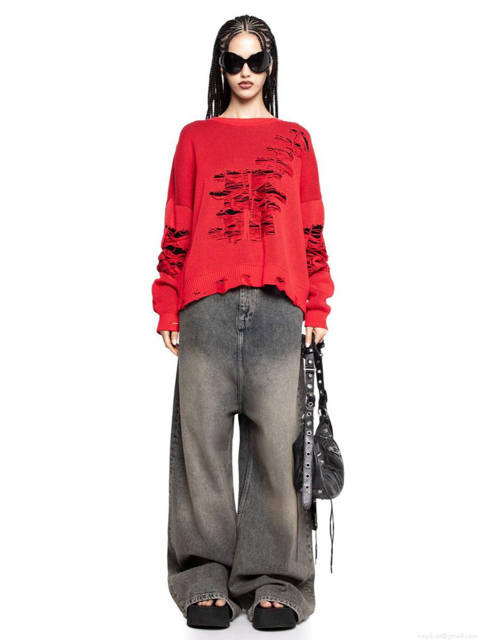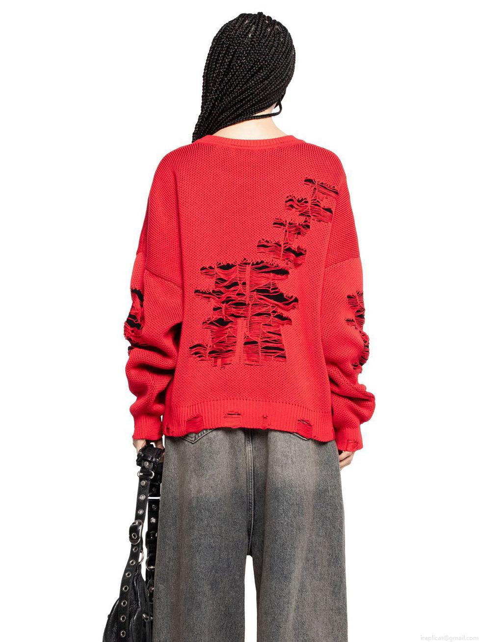• Women's Oversized Distressed Red Knit Sweater Loose Hollow Out Torn Pullover Streetwear Punk Style Long Sleeve Round Neck Knitted Top