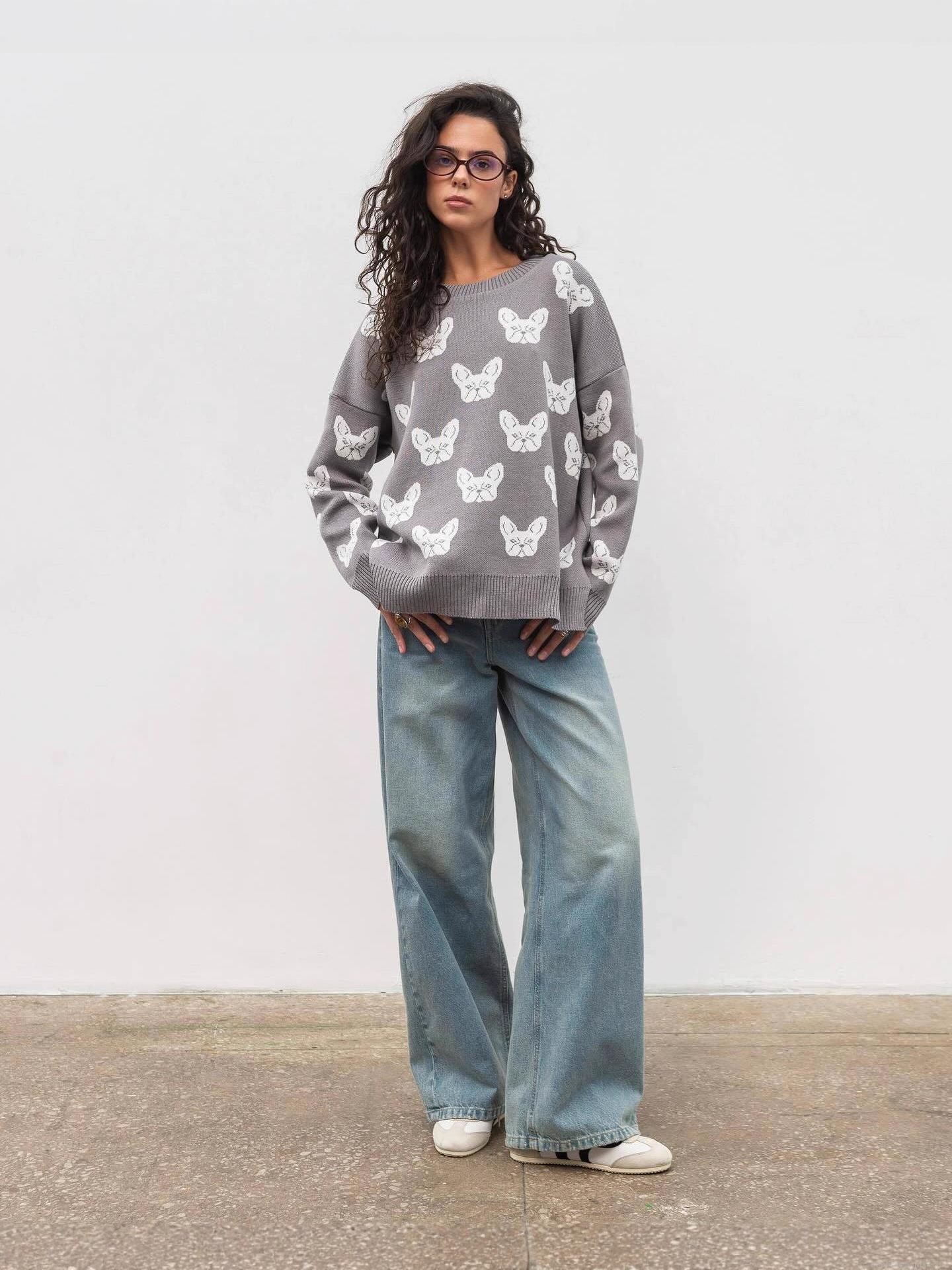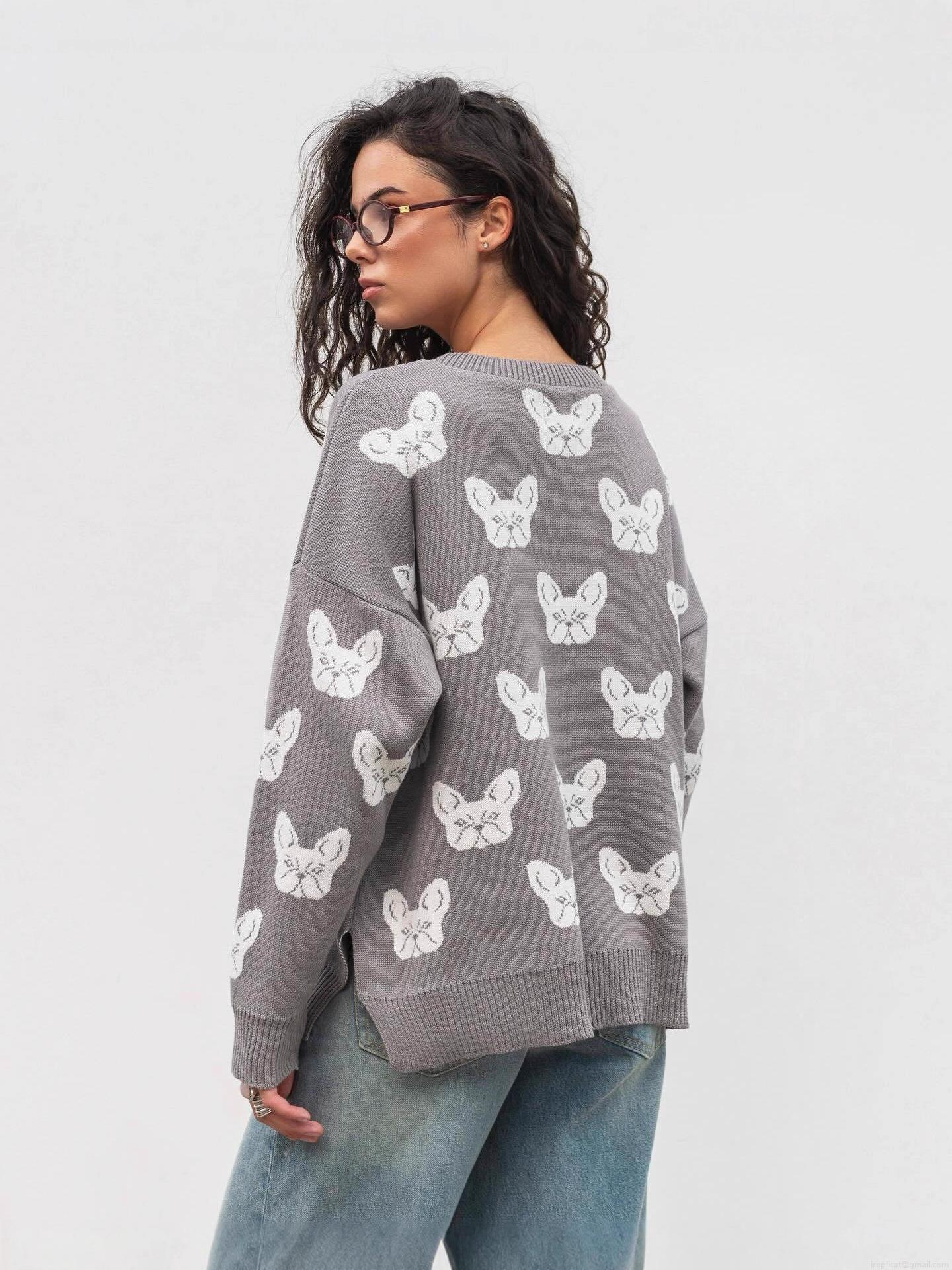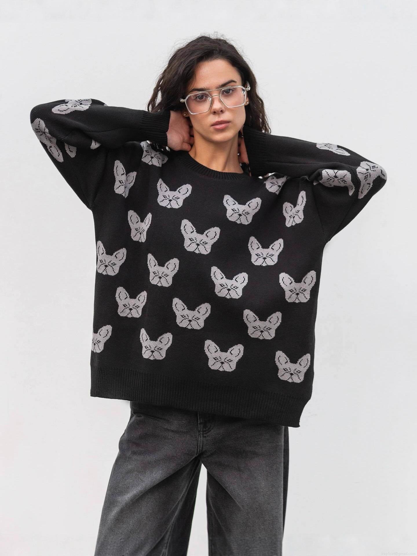 Women's Oversized French Bulldog Jacquard Knit Sweater Loose Round Neck Long Sleeve Pullover Autumn Winter Casual Commuter Jumper Top