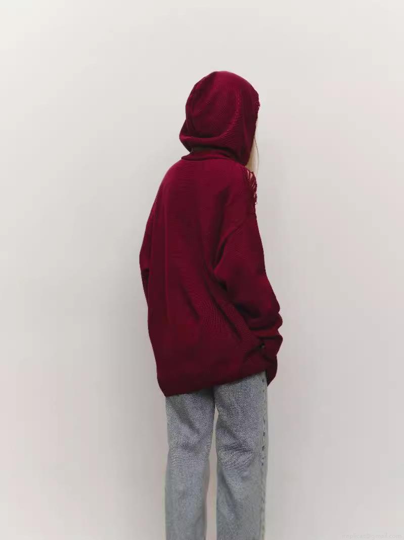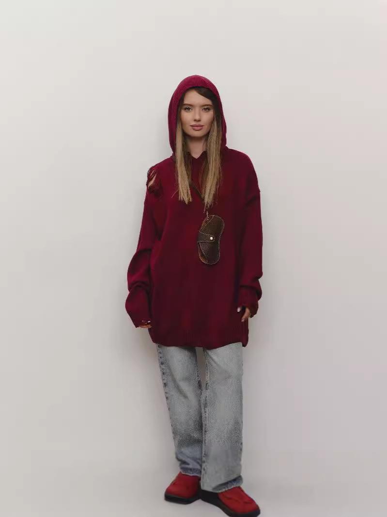 • Women's Oversized Hooded Knit Sweater Cotton Blend Distressed Ripped Shoulder Pullover Long Sleeve Autumn Streetwear Jumper Top