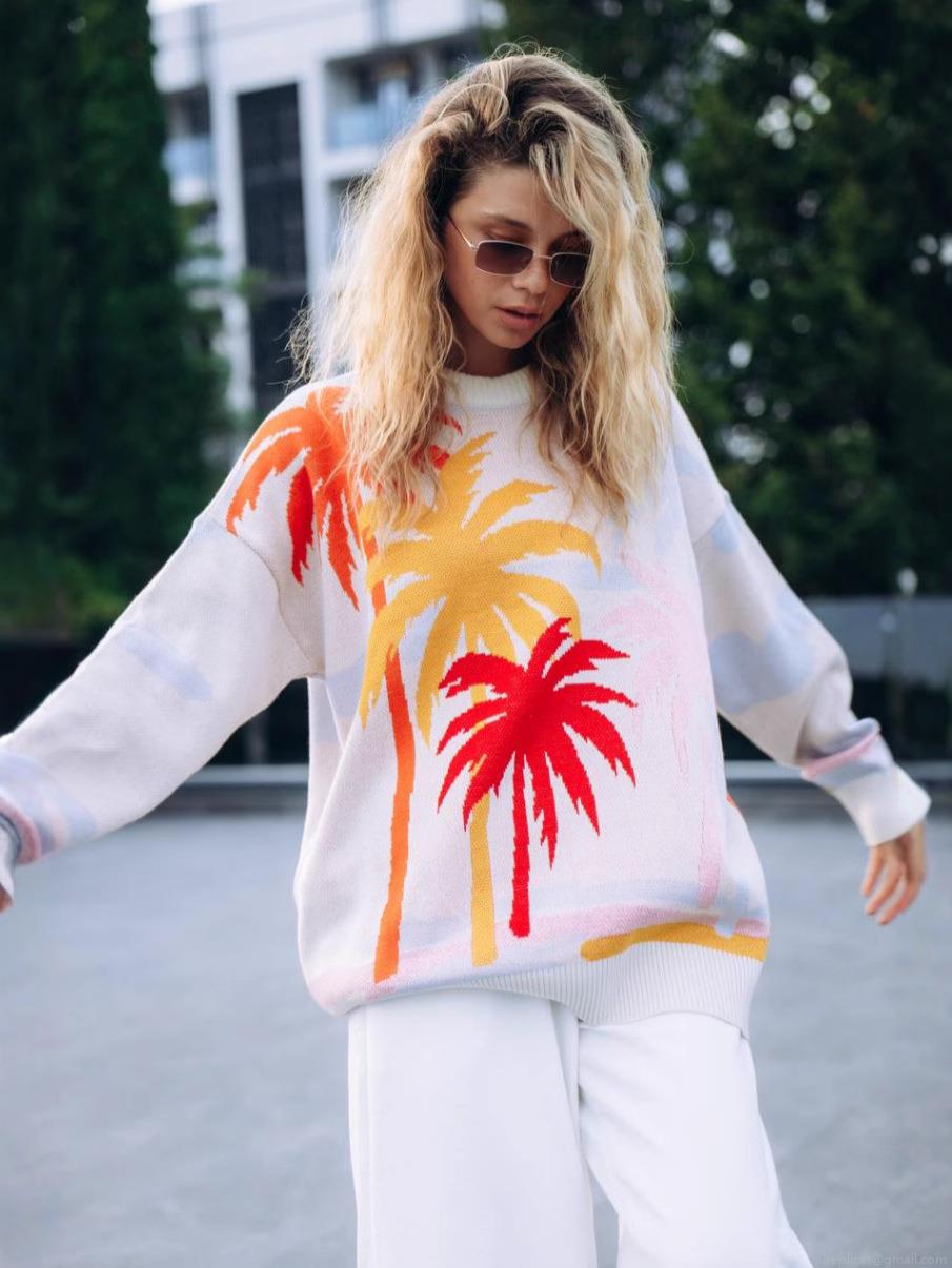 Coconut Tree, Jacquard, Tropical Plants, Color-blocked Jacquard, Loose Silhouette, Dropped Shoulders