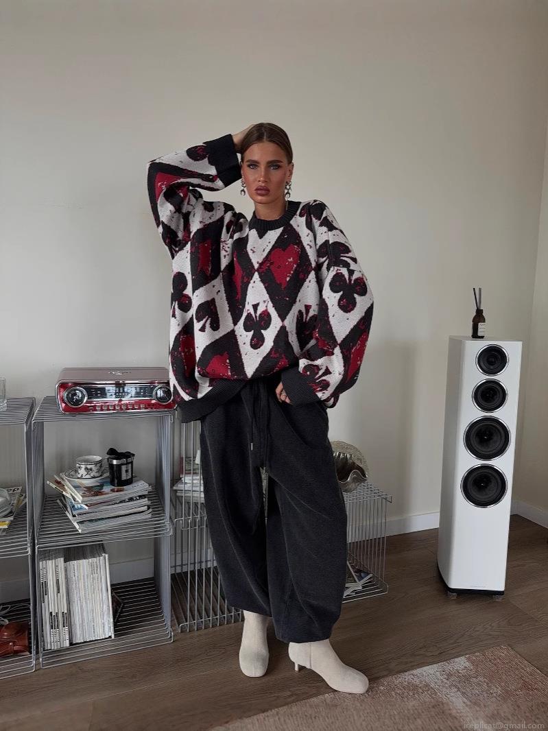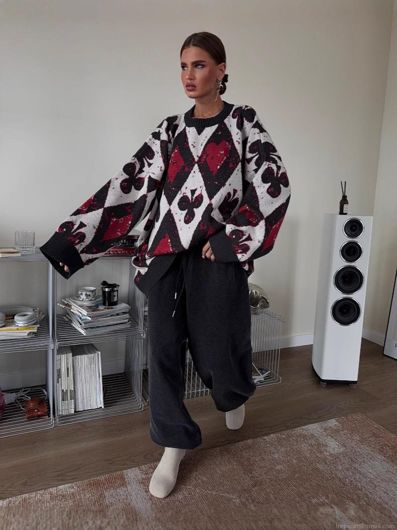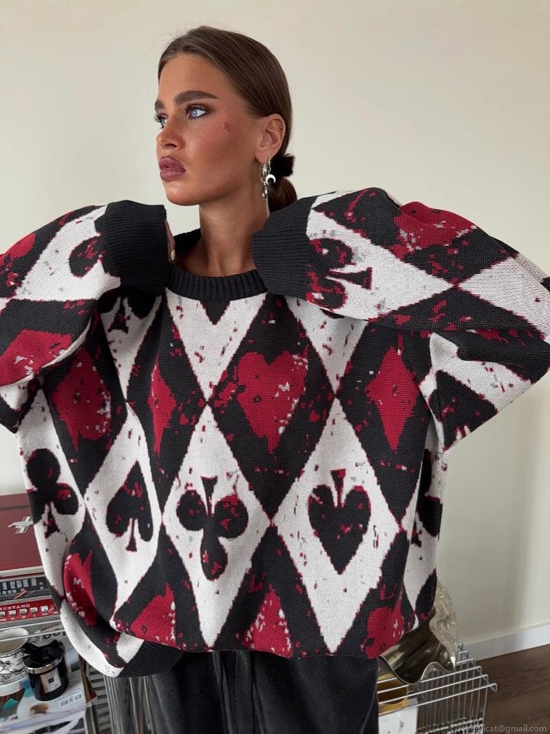 Women's Oversized Knitted Sweater Poker Card Heart Spade Print Argyle Crew Neck Long Sleeve Casual Streetwear Pullover Tops Warm Winter Fashion