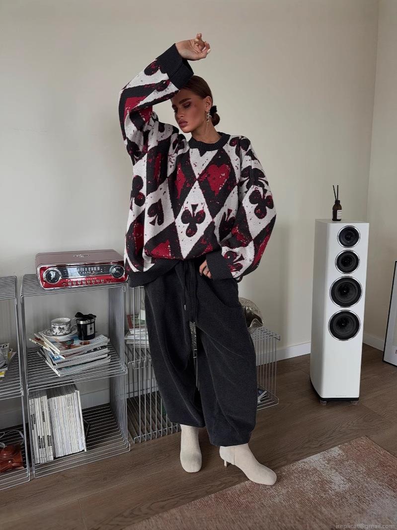 • Women's Oversized Knitted Sweater Poker Card Heart Spade Print Argyle Crew Neck Long Sleeve Casual Streetwear Pullover Tops Warm Winter Fashion