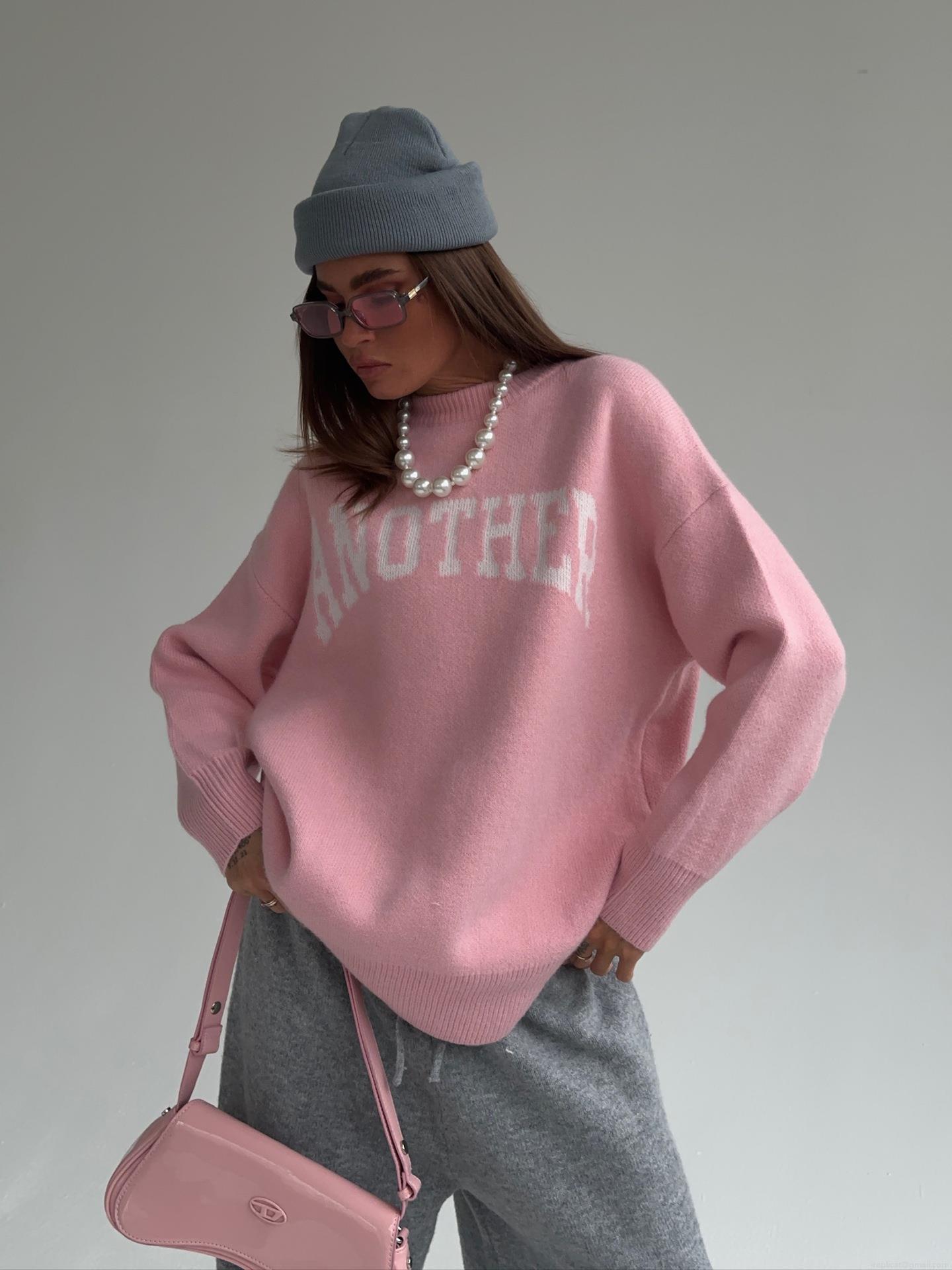 • Women's Oversized Pink Knit Sweater Cotton Blend Crew Neck Letter ANOTHER Jacquard Pullover Long Sleeve Casual Autumn Winter Loose Jumper Top