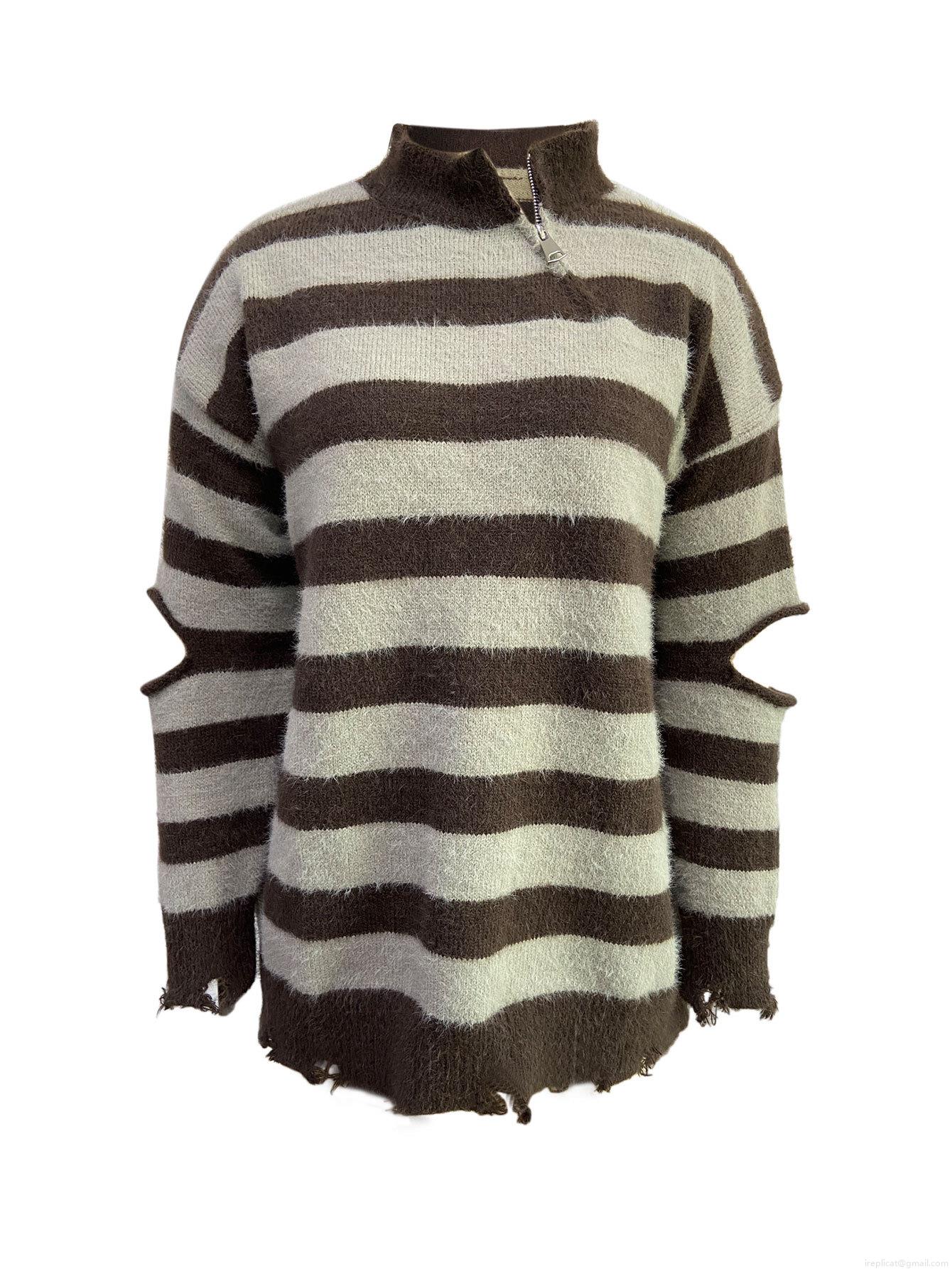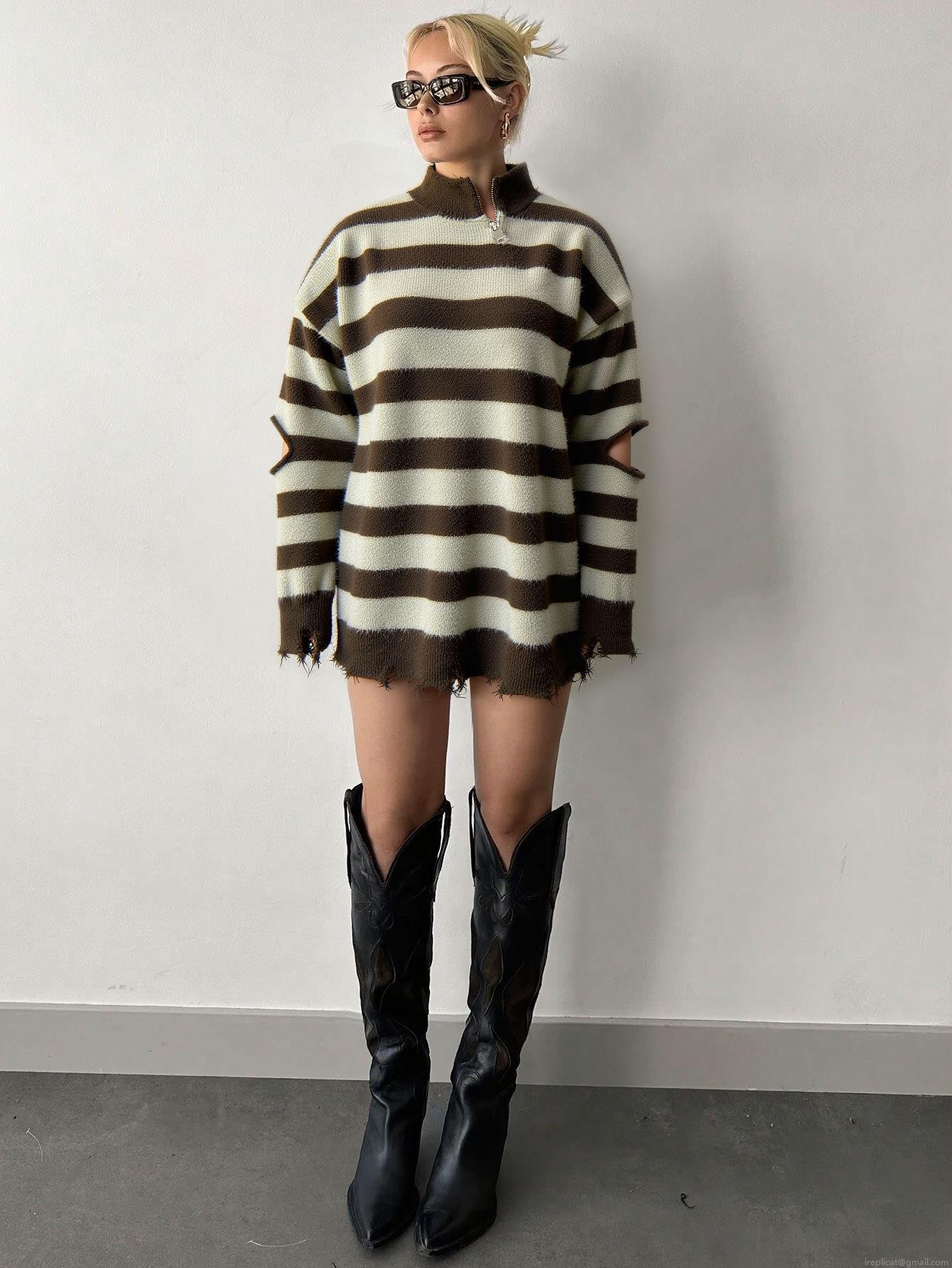 • Women's Oversized Striped Knit Sweater 100% Polyester Half Zip Stand Collar Distressed Ripped Hem Cutout Elbow Long Sleeve Mid-Length Pullover Top