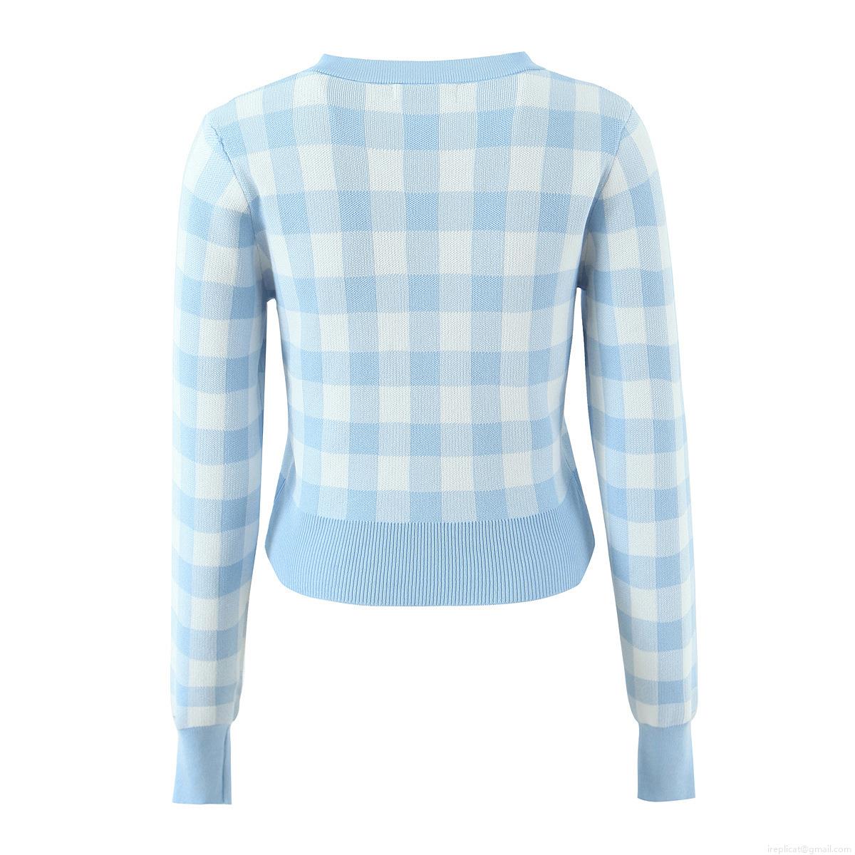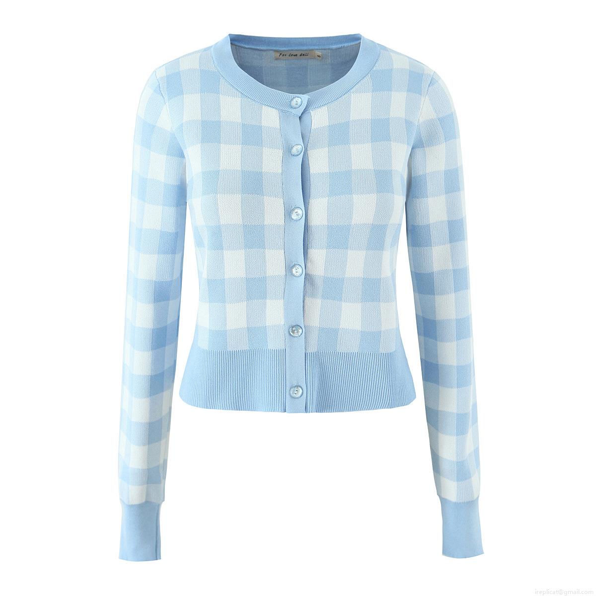 Women's Plaid Knitted Cardigan Sweet Gingham Check Long Sleeve Round Neck Button Up Short Sweater Jacket For Lady Streetwear