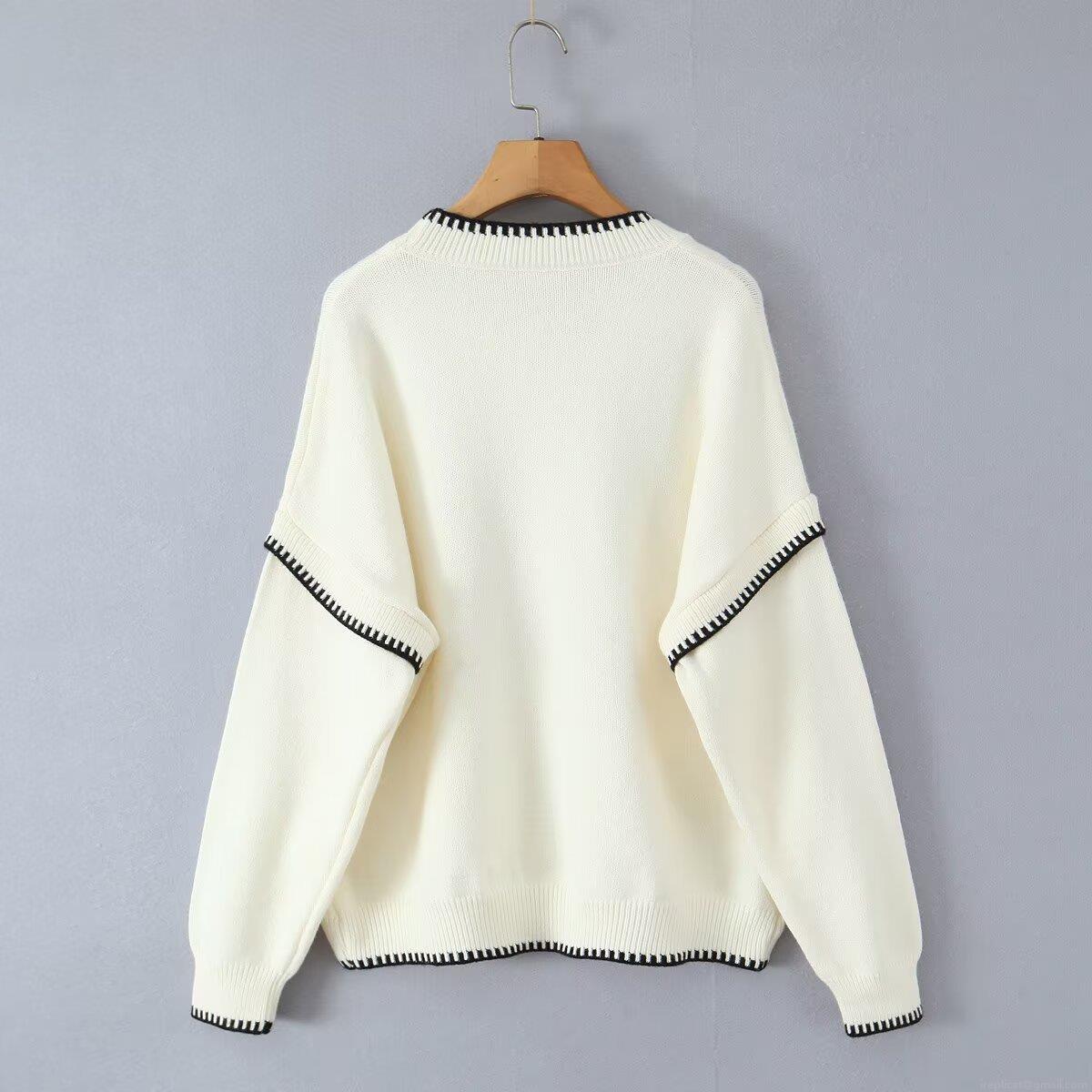 • Women's Polyester Knit Sweater Contrast Stitch Round Neck Loose Casual Long Sleeve Pullover Jumper Minimalist Fashionable Soft Knitwear Tops