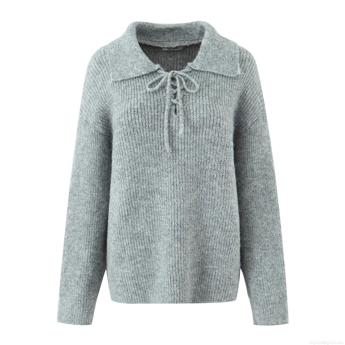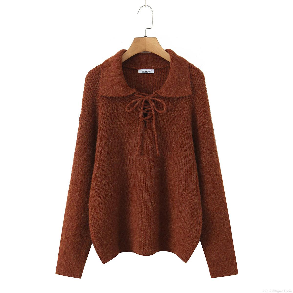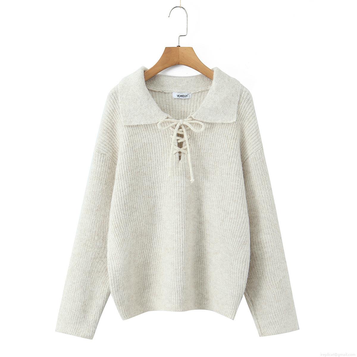 • Women's Polyester Nylon Wool Blend Long Sleeve Pullover Sweater With Lapel Collar Lace-up Design Knitted Jumper For Autumn Winter