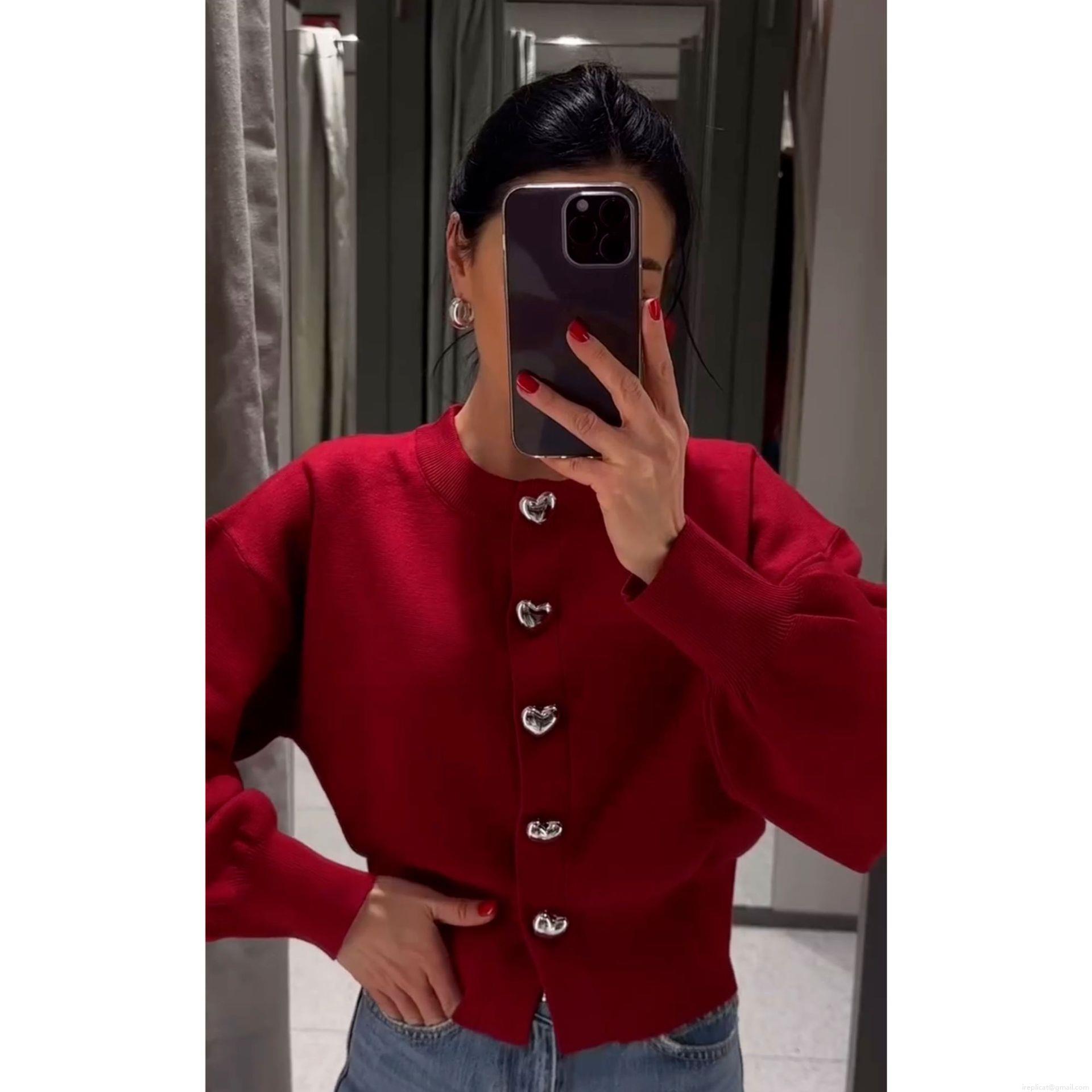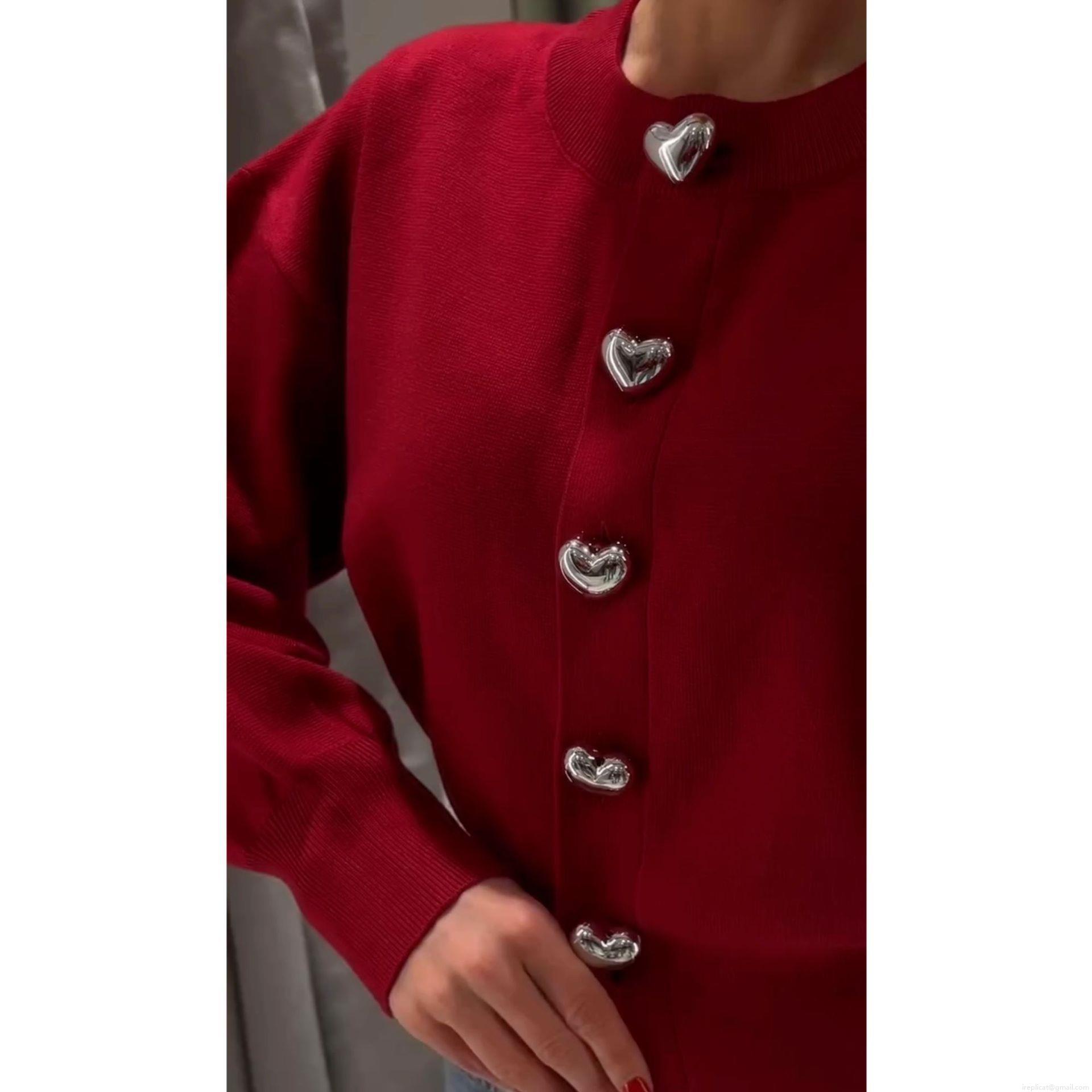 Women's Red Knit Cardigan Sweater With Silver Heart Shaped Buttons Casual Crew Neck Long Sleeve Knitted Polyester Top For Women Streetwear