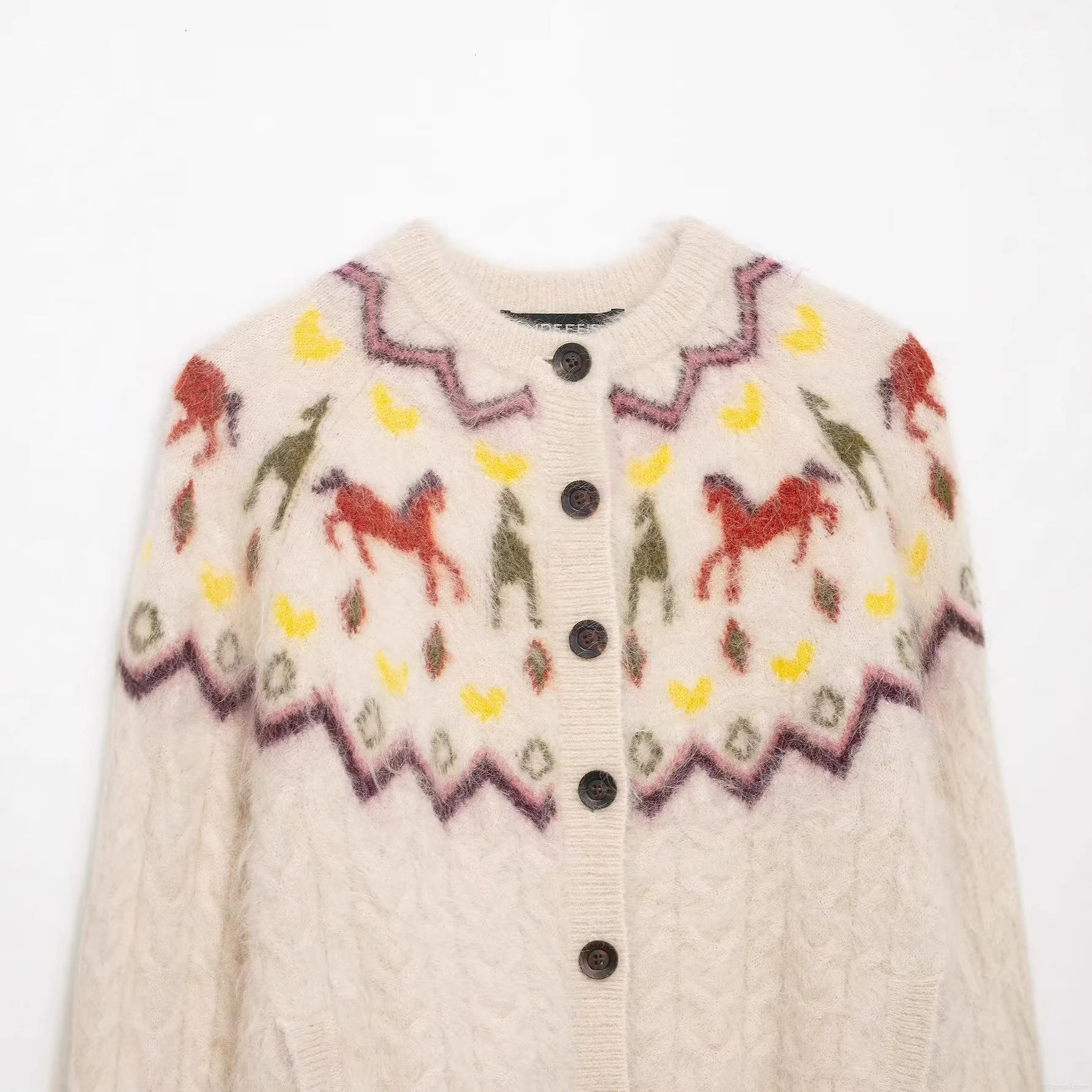 • Women's Retro Knitted Cardigan Sweater Fair Isle Horse Pattern Round Neck Long Sleeve Single Breasted Knitwear Top Women Casual Soft Polyester Outerwear
