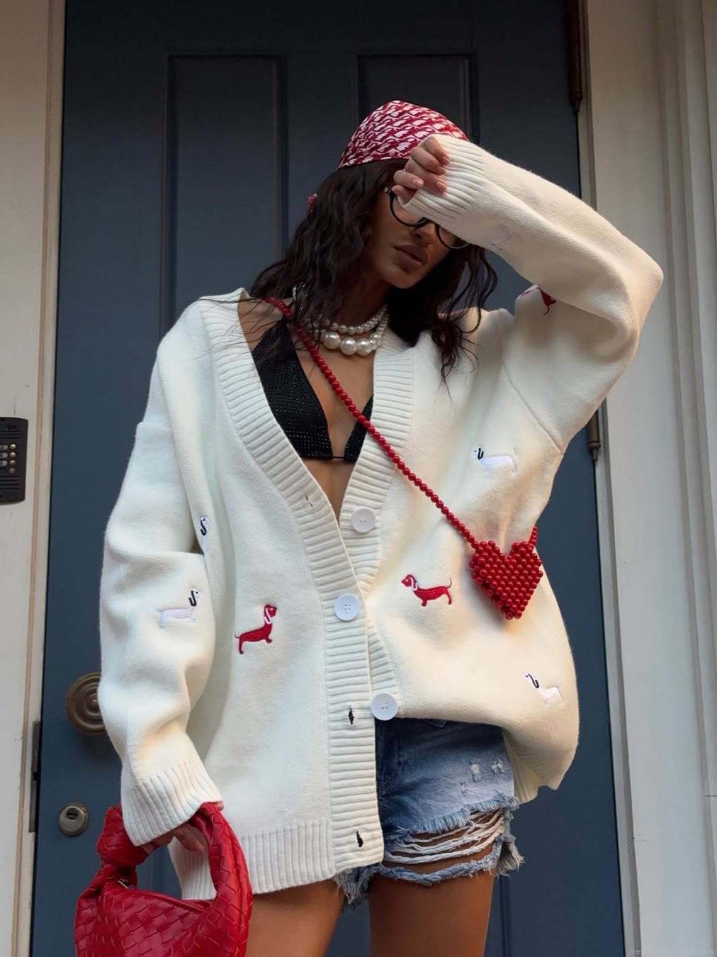 Women's Retro V-Neck Knitted Cardigan With Dog Embroidery Long Sleeve Single Breasted Cotton Blend Sweater Oversized Lazy Style Fall Winter Outerwear Top