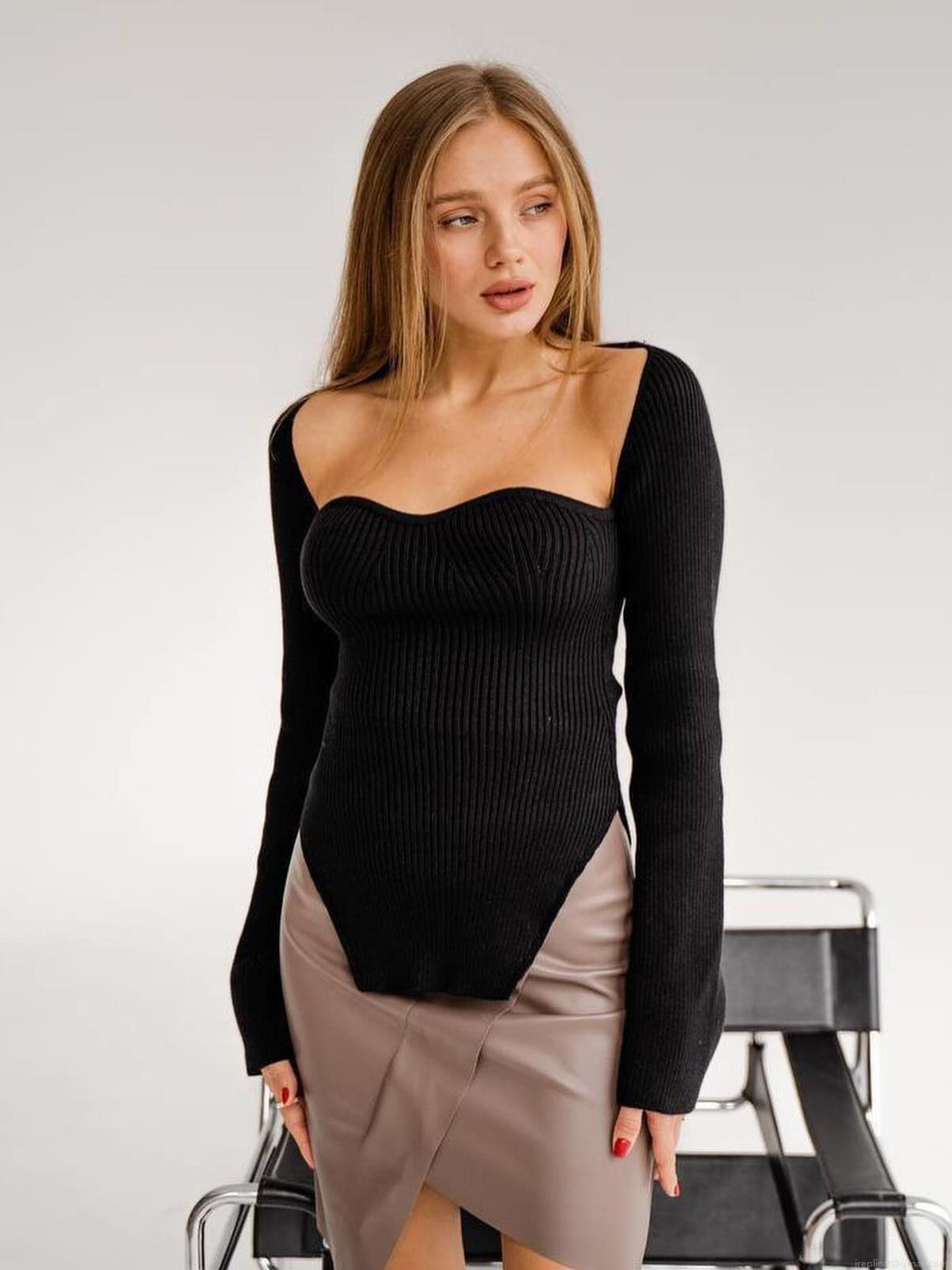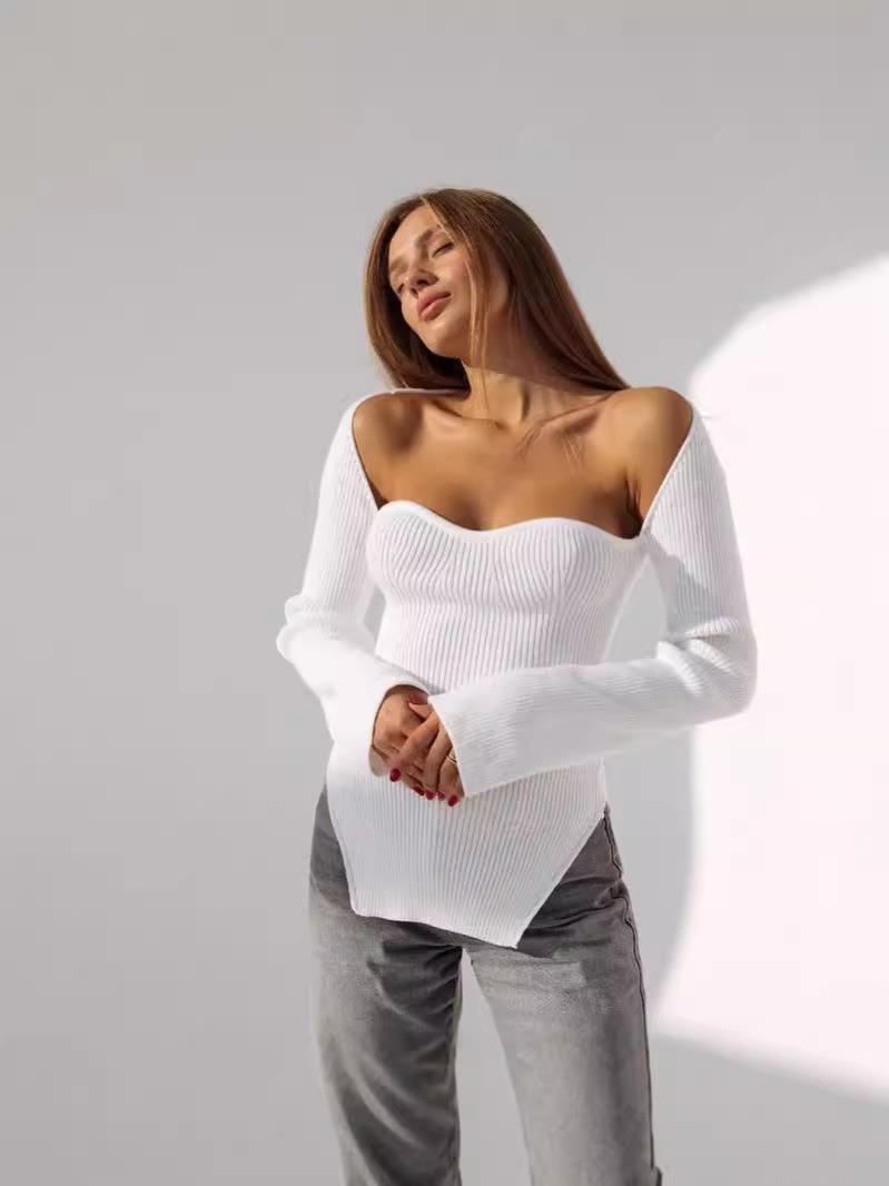 • Women's Ribbed Knit Sweater Sweetheart Neck Sexy Slim Fit Long Sleeve Pullover Asymmetric Hem Side Slit Tops Fashion Casual Autumn Winter Jumper for Women Streetwear