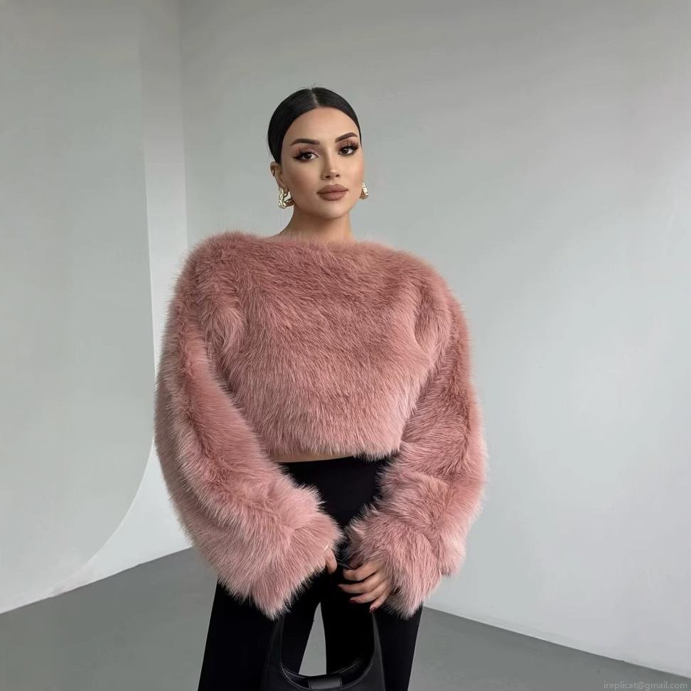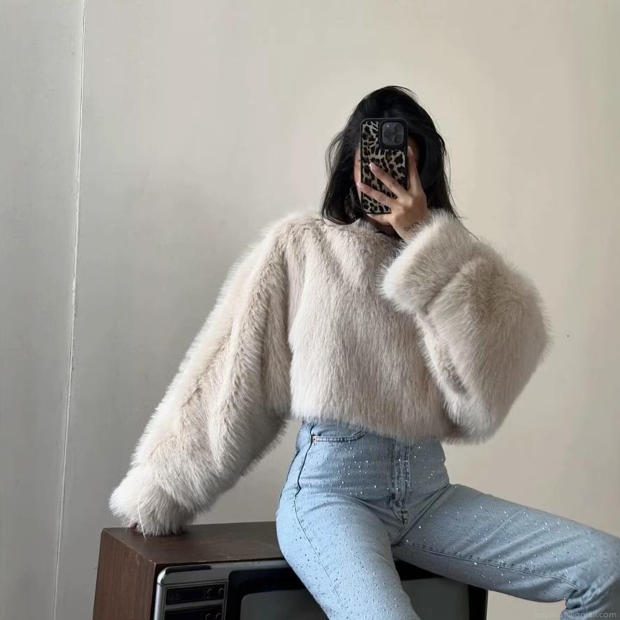 • Women's Sexy Faux Fur Cropped Top Loose Round Neck Long Sleeve Plush Shirt Streetwear Winter Warm Shaggy Sweater For Ladies Solid Color Soft Fuzzy Texture