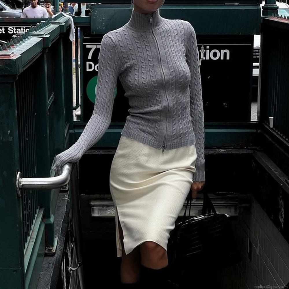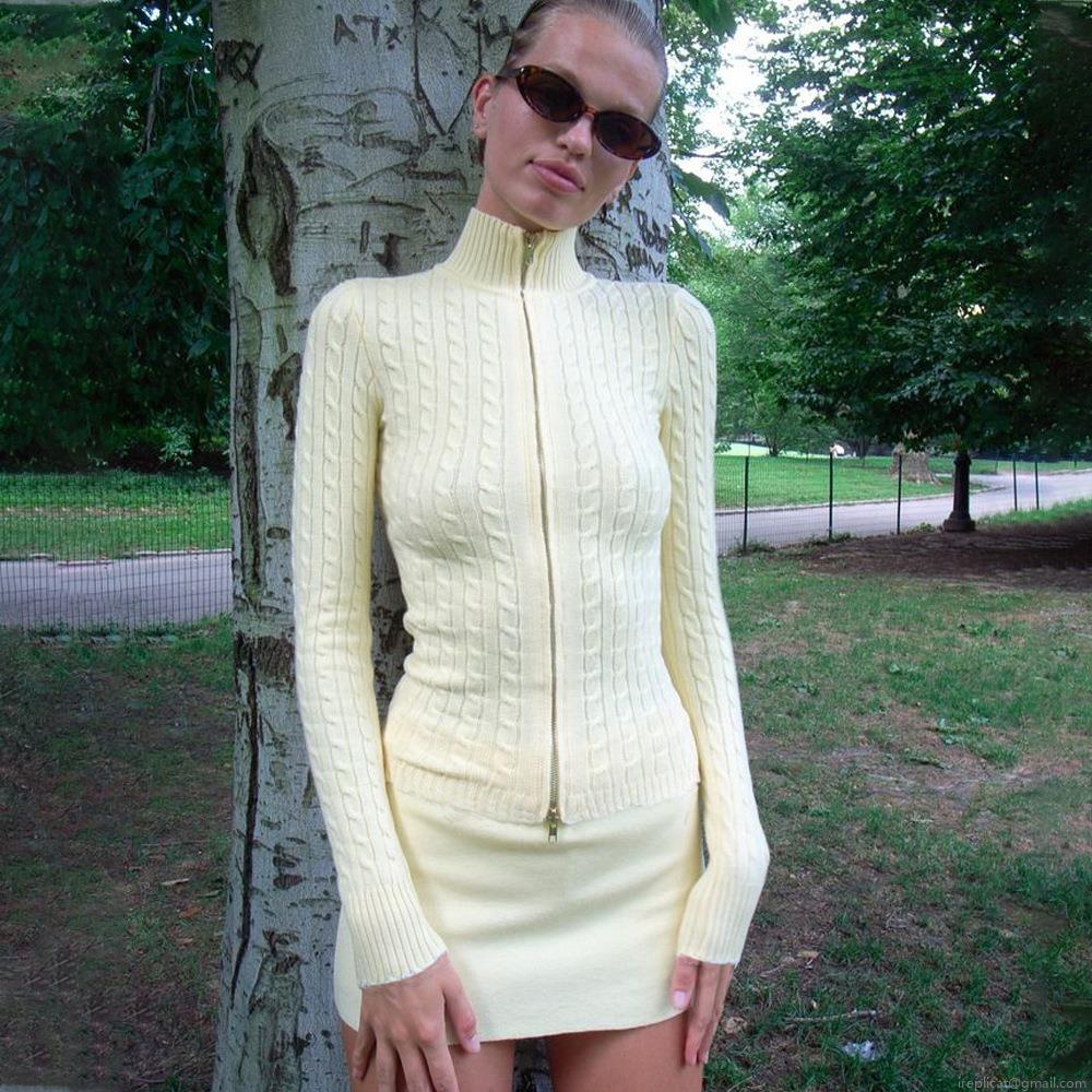 • Women's Sexy Slim Fit Cable Knit Zip Up Sweater Semi High Collar Long Sleeve Ribbed Knitwear Polyester Jumper Top For Autumn Winter