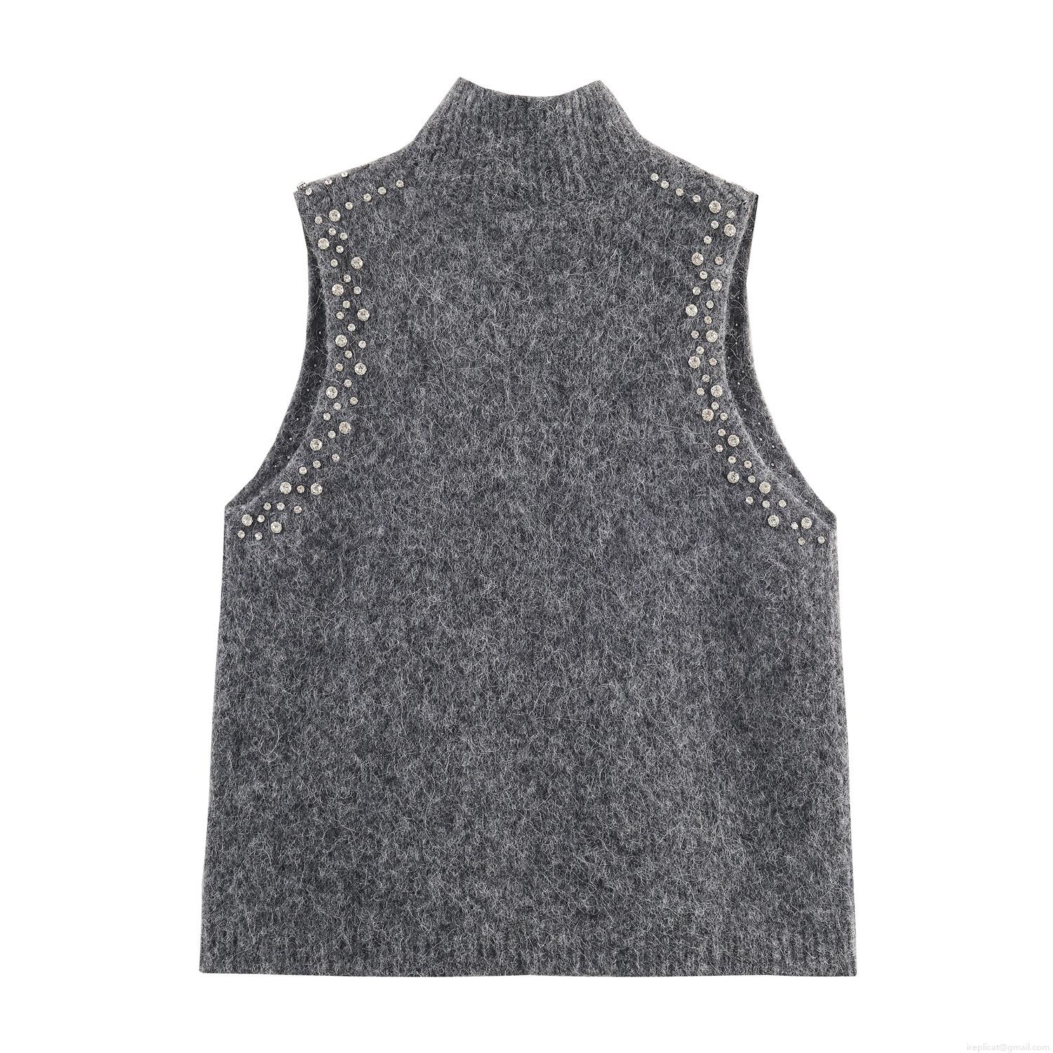 • Women's Sleeveless Knit Sweater Vest High Neck Rhinestone Pearl Embellished Pullover Top Loose Autumn Winter Streetwear Gray Fashion Knitwear