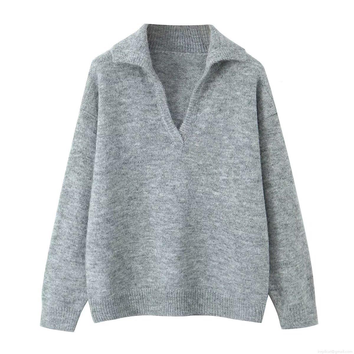 • Women's Solid Color Knit Sweater Lapel V-Neck Loose Long Sleeve Pullover Warm Jumper Top For Autumn Winter