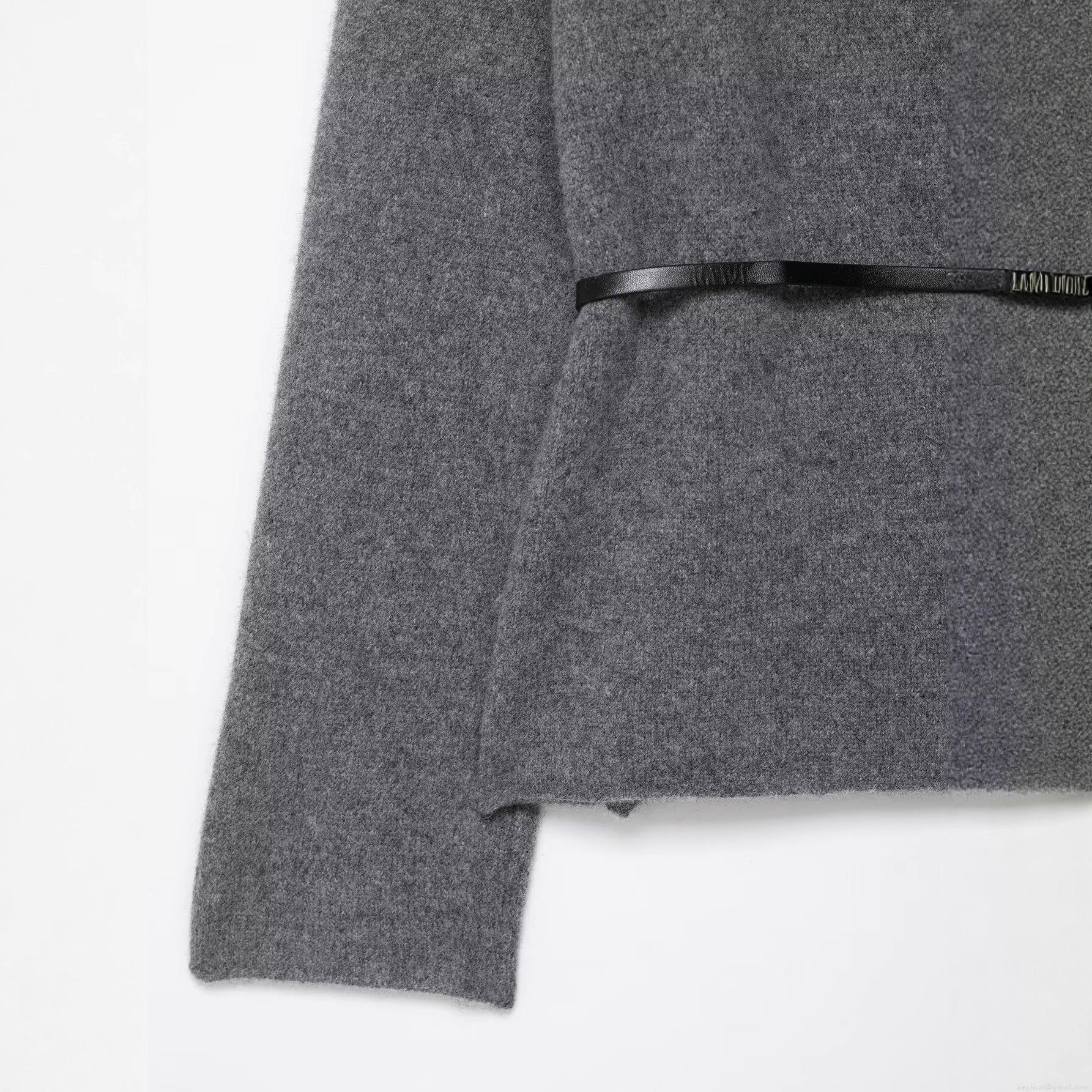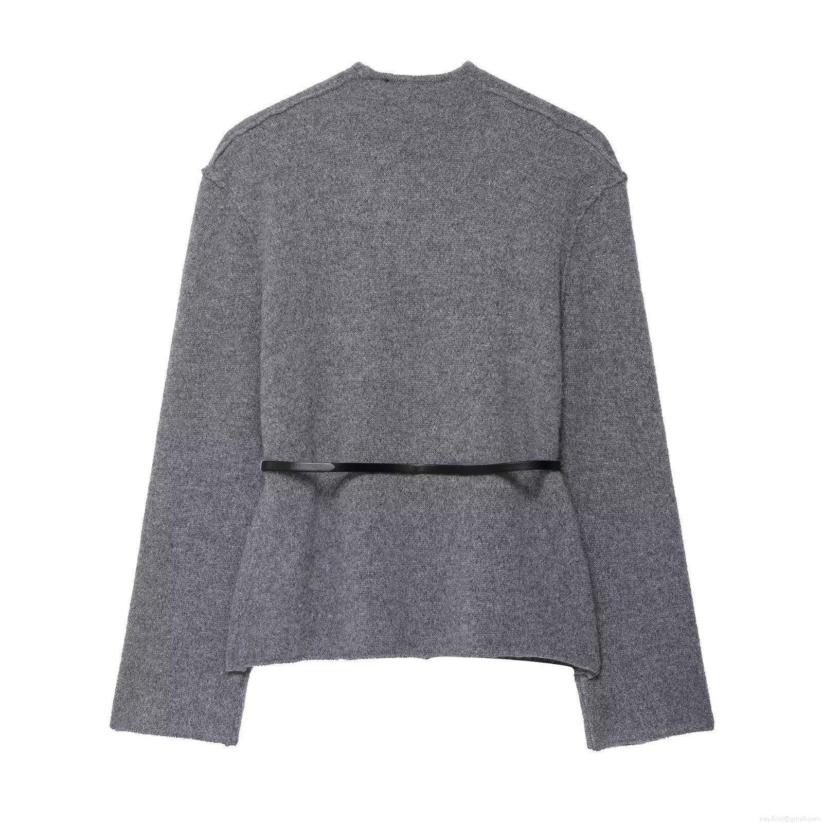 Women's Solid Gray Knitted Pullover Sweater With Black Leather Belt Long Sleeve V-Neck Western Style Casual Autumn Winter Warm Knitwear Top