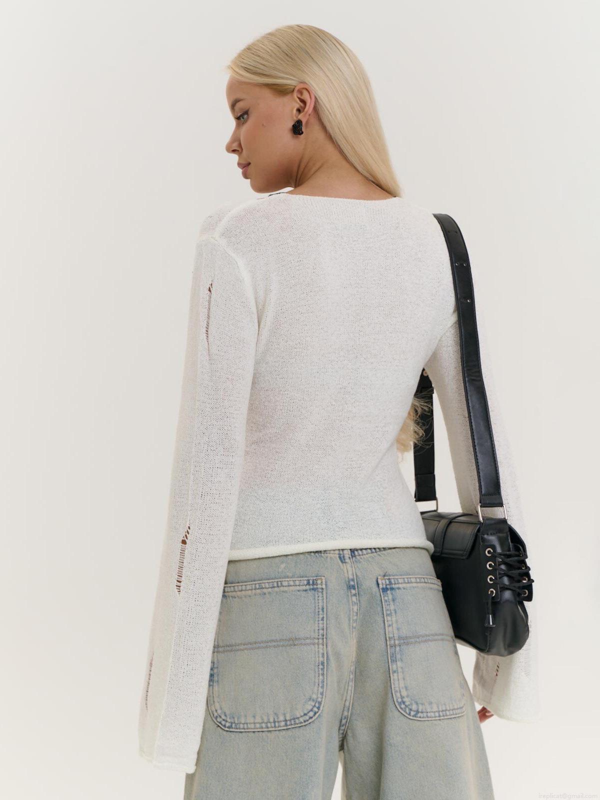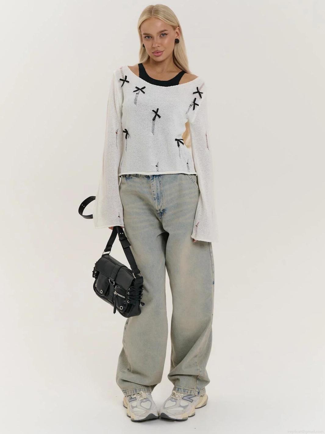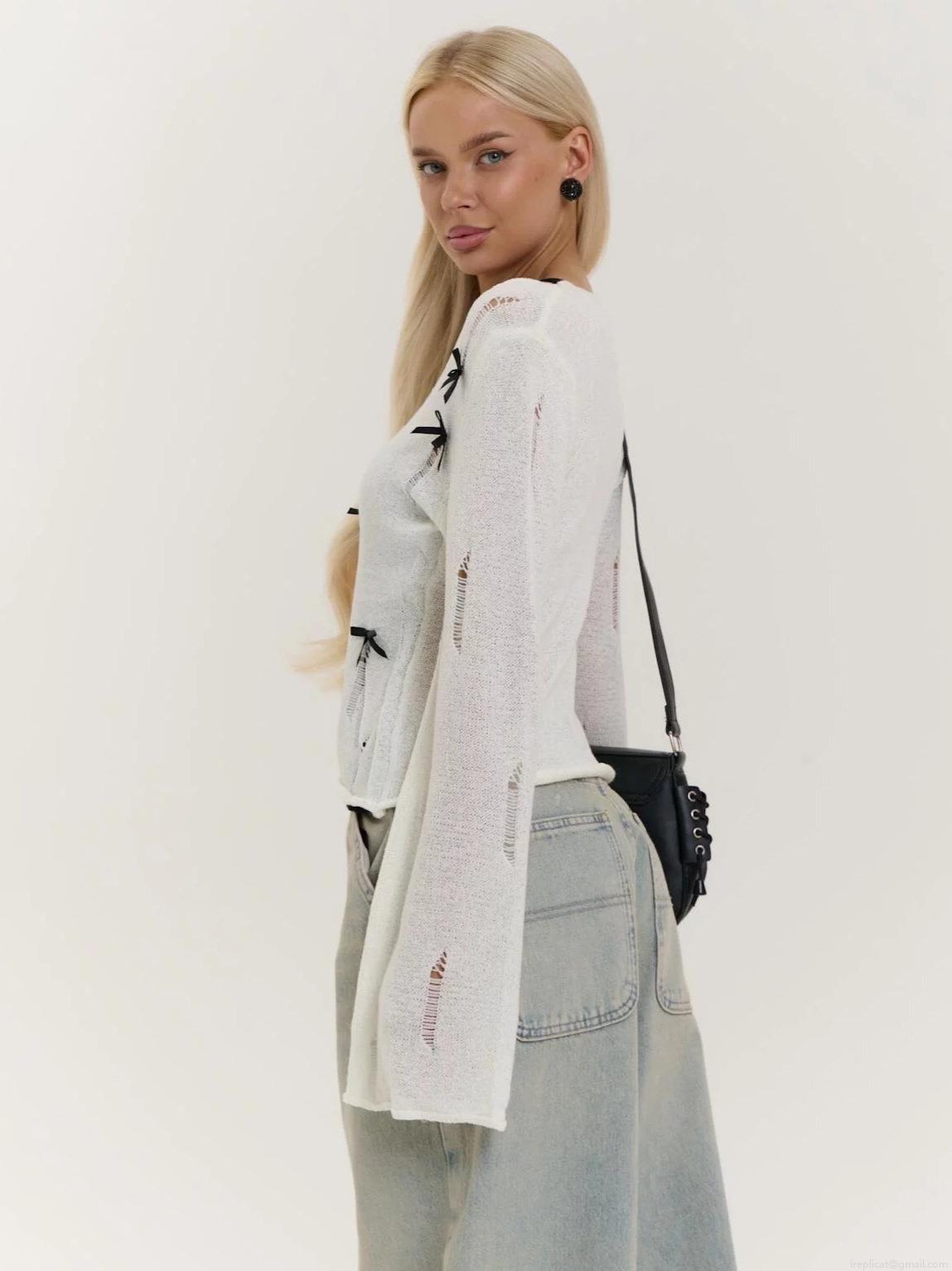 • Women's Street Style White Distressed Knit Sweater With Black Ribbon Bows Splicing Long Sleeve Round Neck Loose Pullover Autumn Top Casual Sweet Cool Knitwear