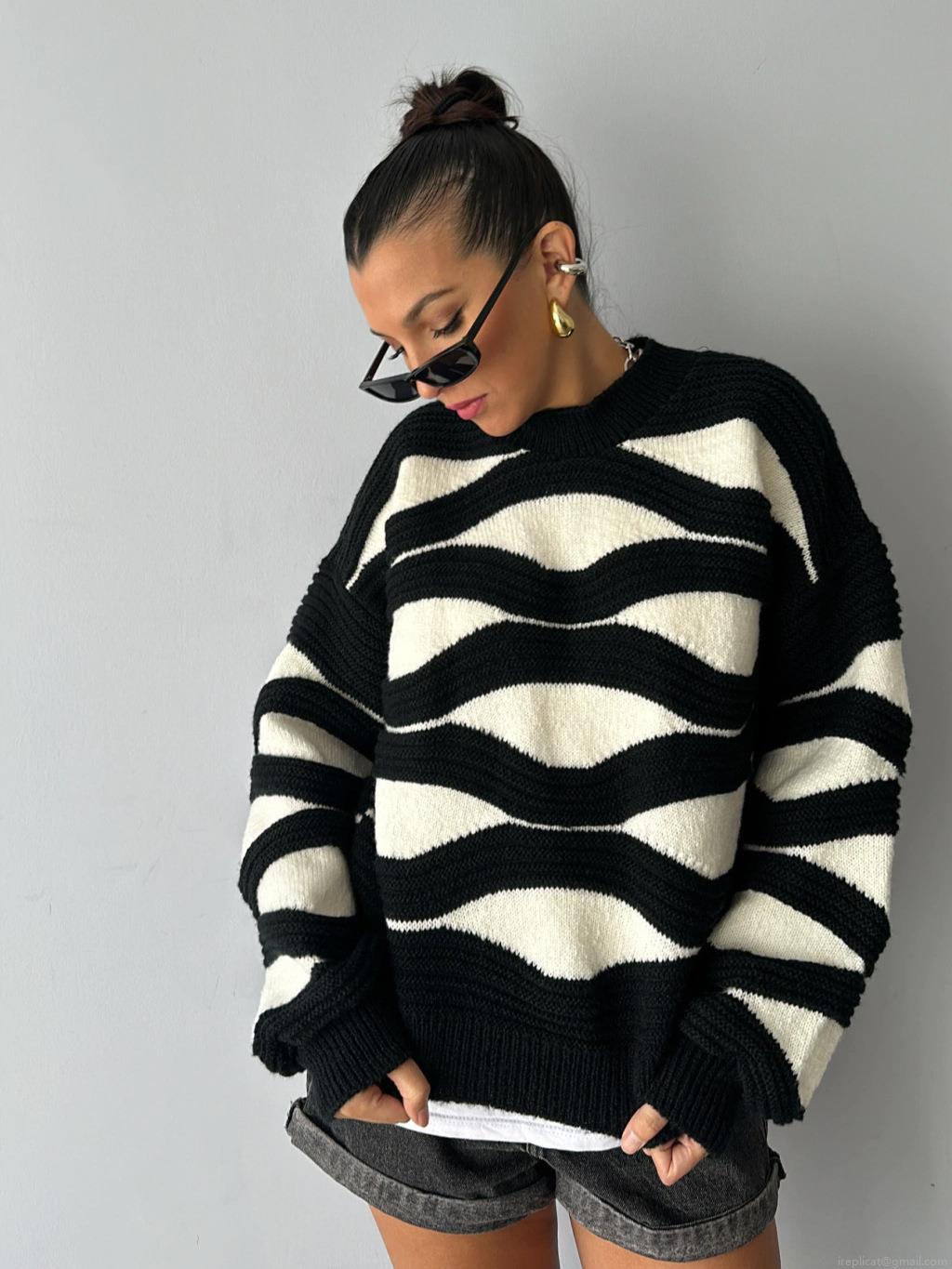 • Women's Stripe Knit Sweater Loose Round Neck Pullover Long Sleeve Cotton Blend Wavy Striped Jumper Autumn Winter Casual Top