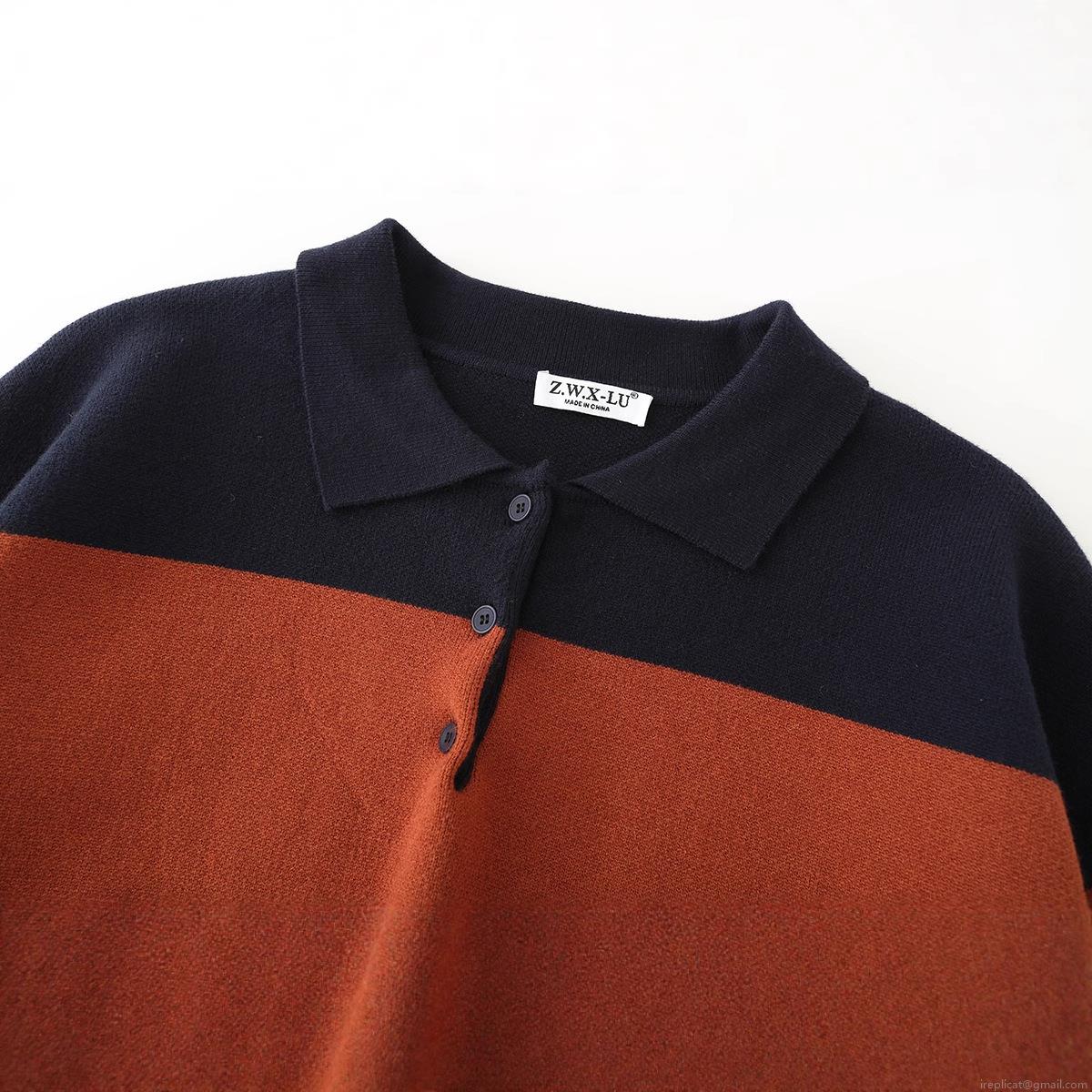 Stripe, Color Blocking, Polo Collar, Button Decoration, Ribbed Seam