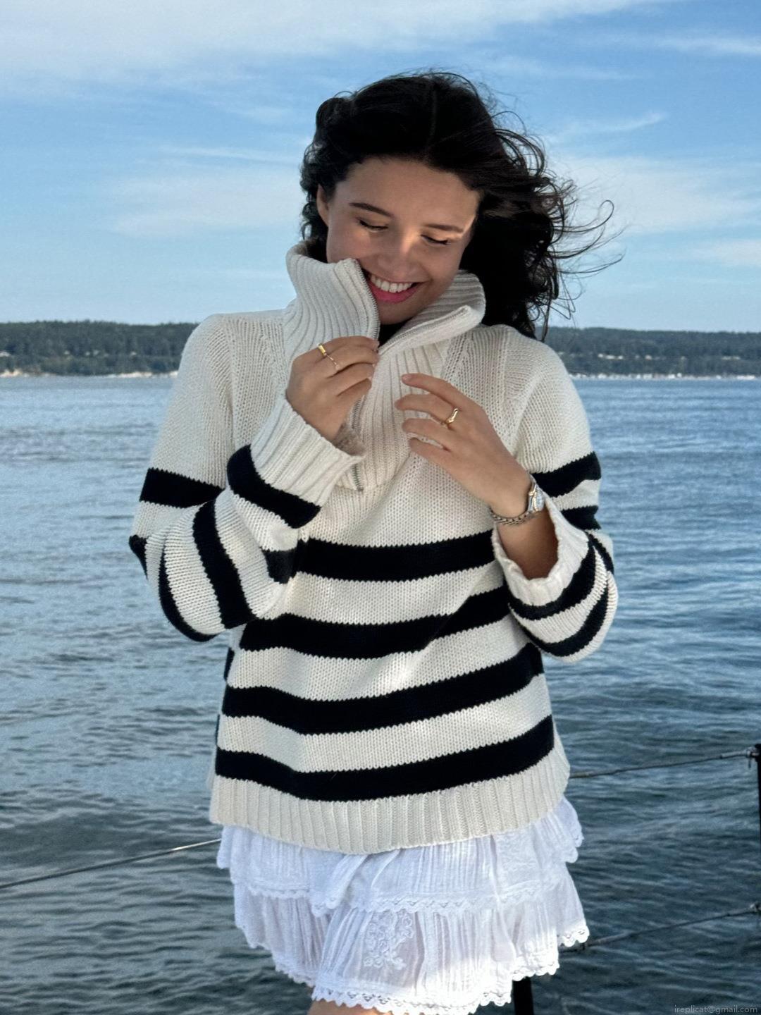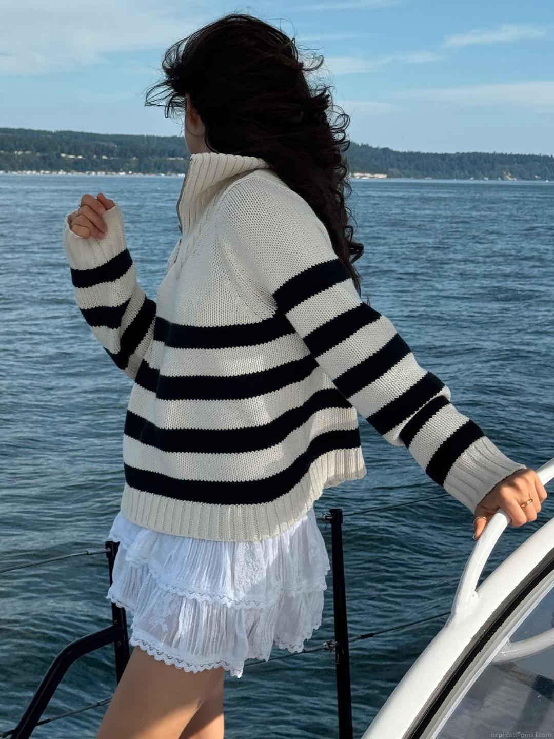 • Women's Striped Half Zipper High Neck Knitted Sweater Casual Long Sleeve Cotton Blend Loose Pullover Top for Vacation Daily Streetwear