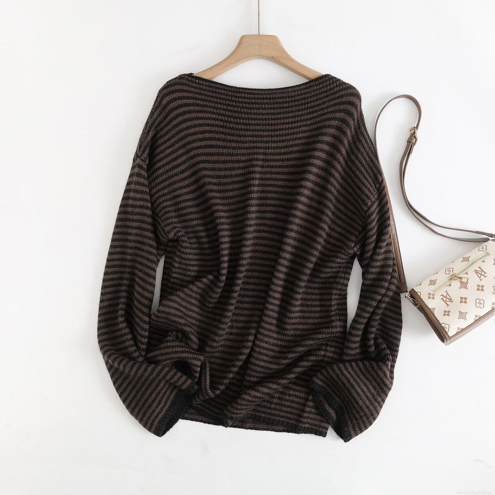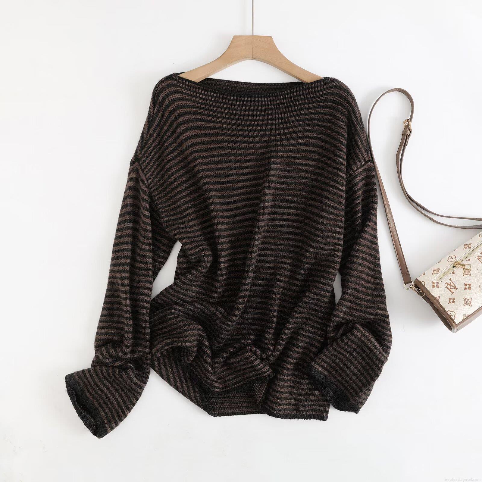 • Women's Striped Knit Sweater 75% Acrylic 15% Wool 10% Nylon Boat Neck Long Sleeve Loose Fit Casual Pullover Top Daily Fall Winter Women Knitwear