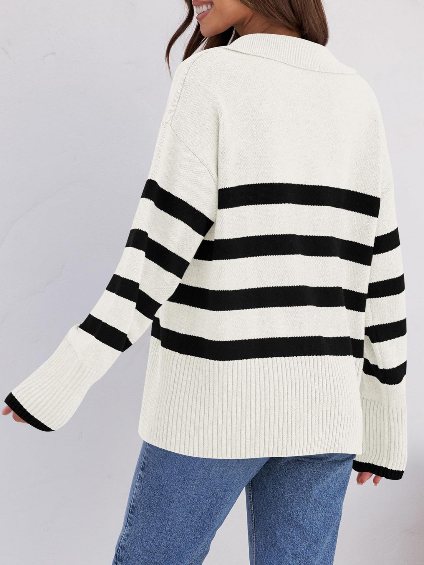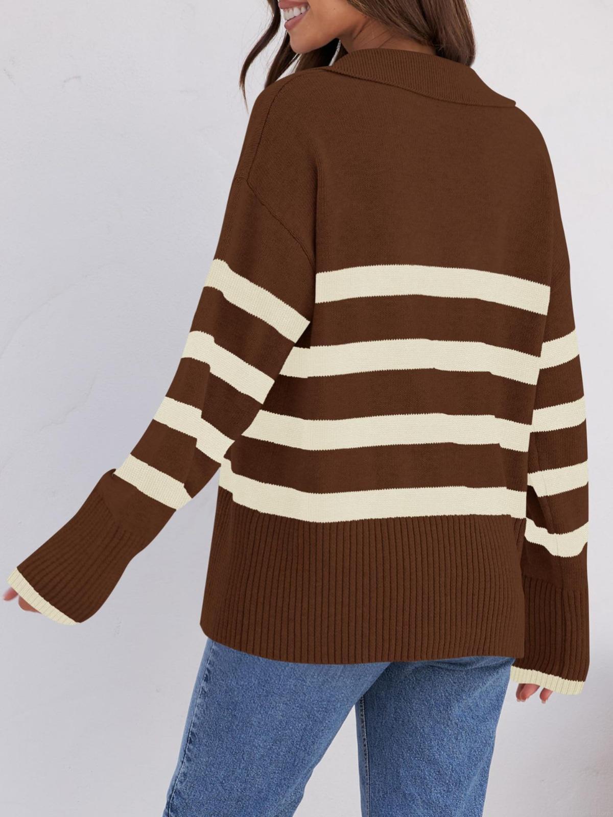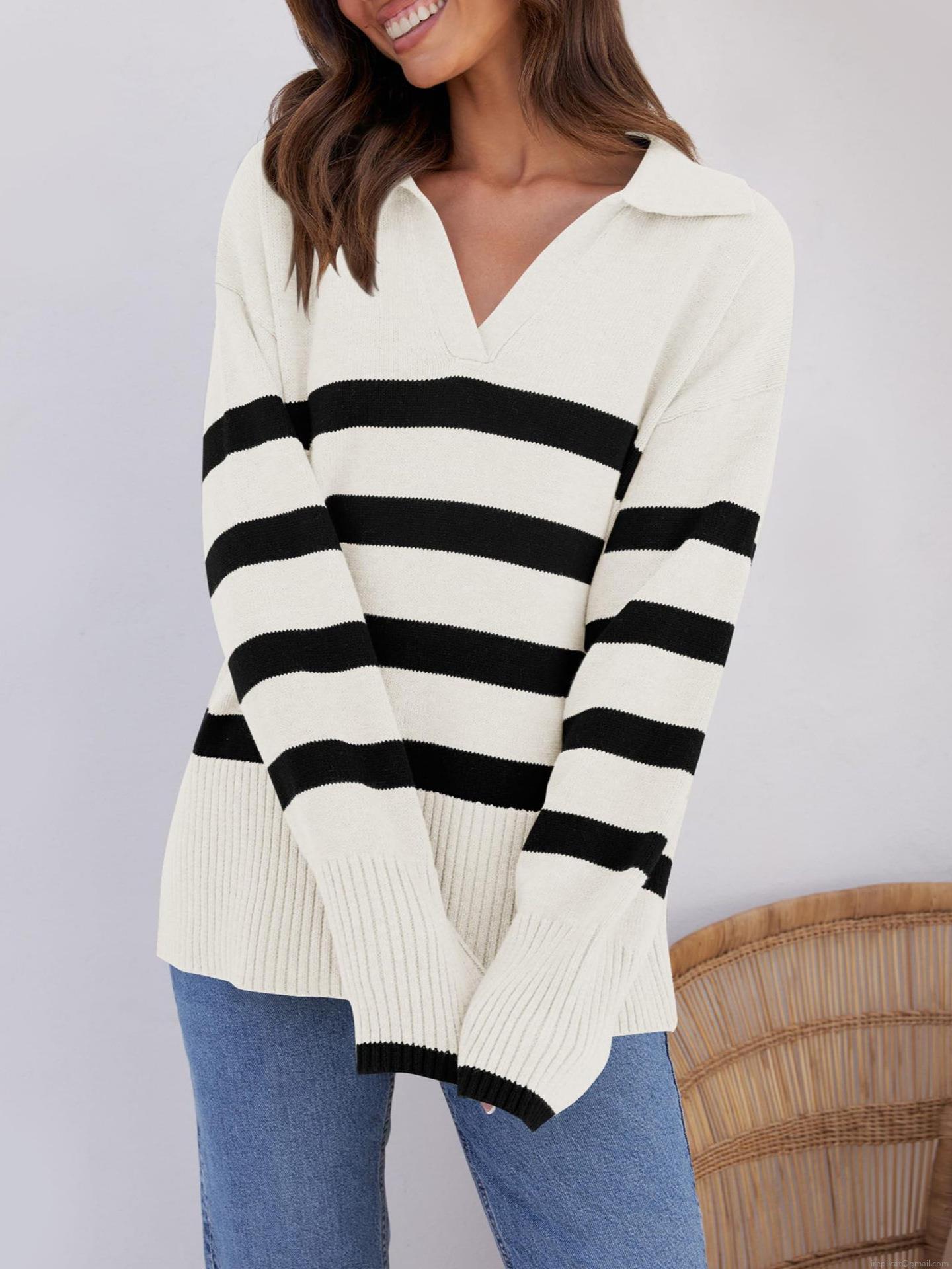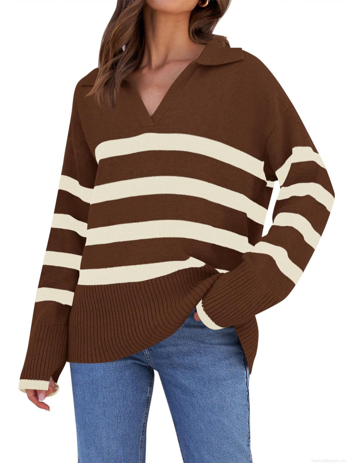 • Women's Striped Knit Sweater Lapel V Neck Loose Fit Long Sleeve Pullover Polyester Spandex Blend Jumper For Autumn Winter Casual Office Wear
