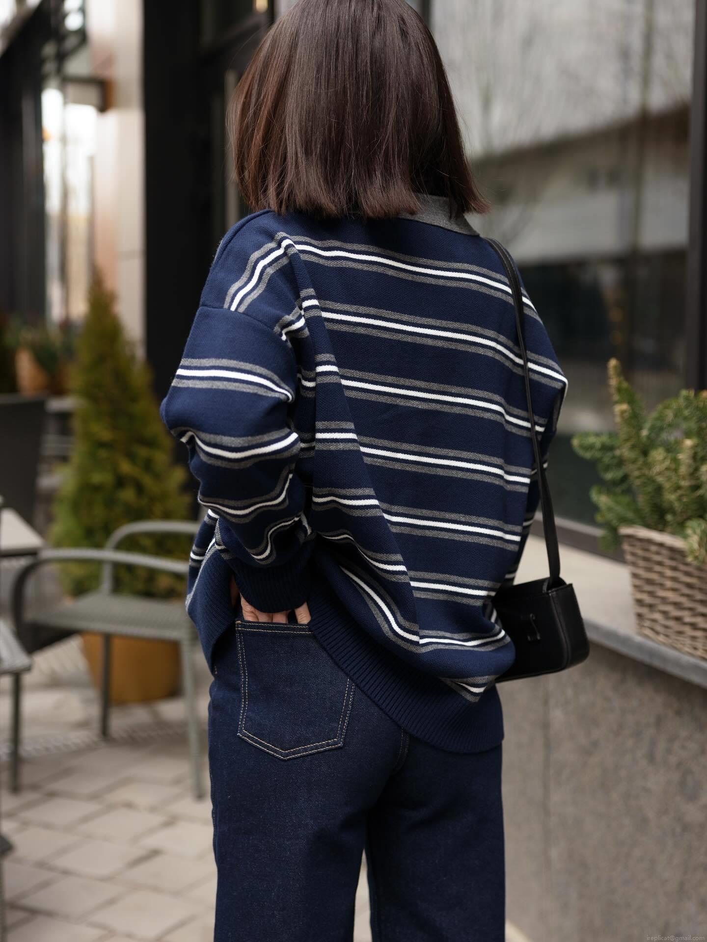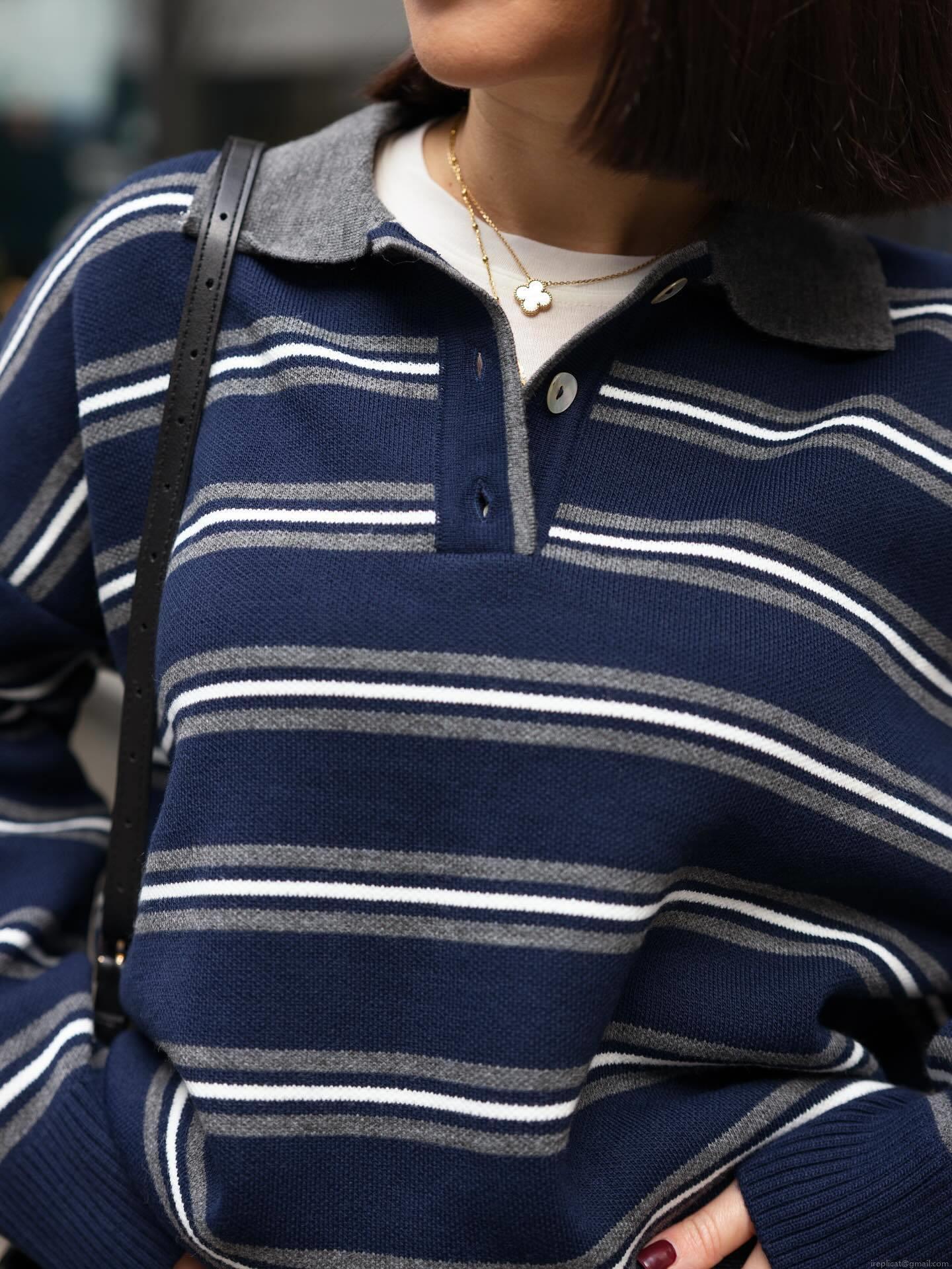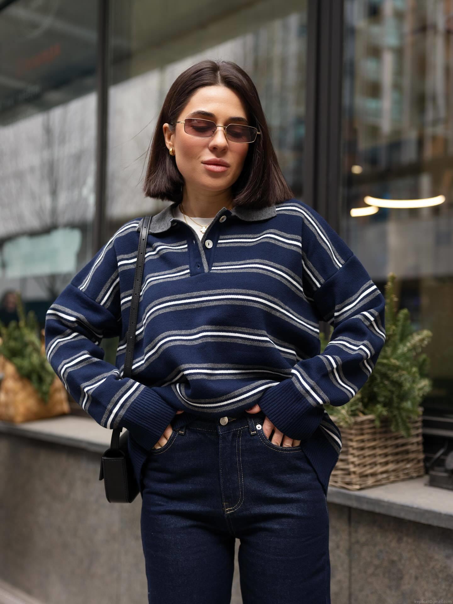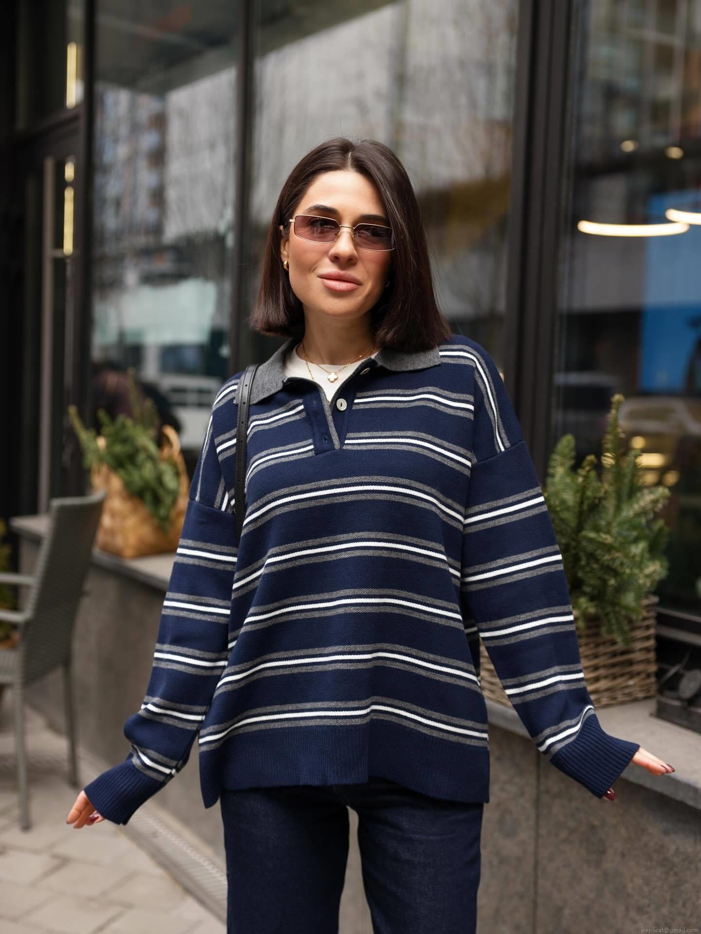 • Women's Striped Knit Sweater Polo Collar Long Sleeve Casual Loose Pullover Top Cotton Blend Retro Commuting Style Ladies Jumper