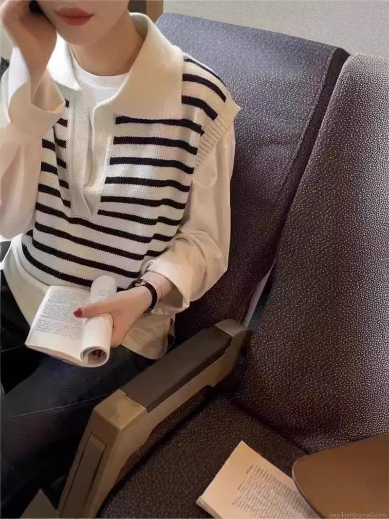 • Women's Striped Knit Vest Polo Collar Sleeveless Sweater Pullover Casual Layering Top Soft Polyester Blend Fashion Waistcoat For Fall Winter Women