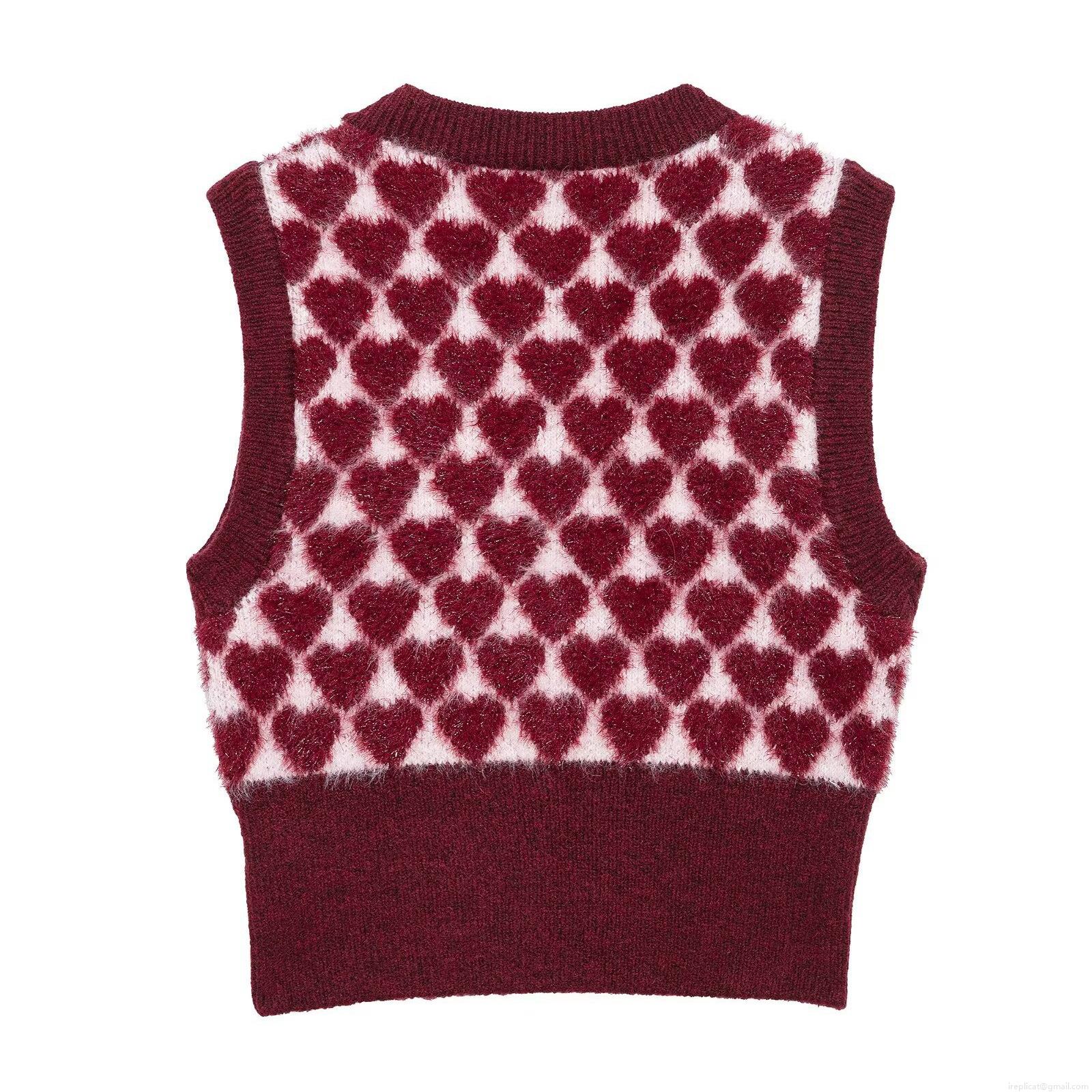 • Women's Sweet Heart Jacquard Knitted Vest Short Crew Neck Button Down Gilet Heart Pattern Soft Sleeveless Sweater Cardigan For Spring Streetwear
