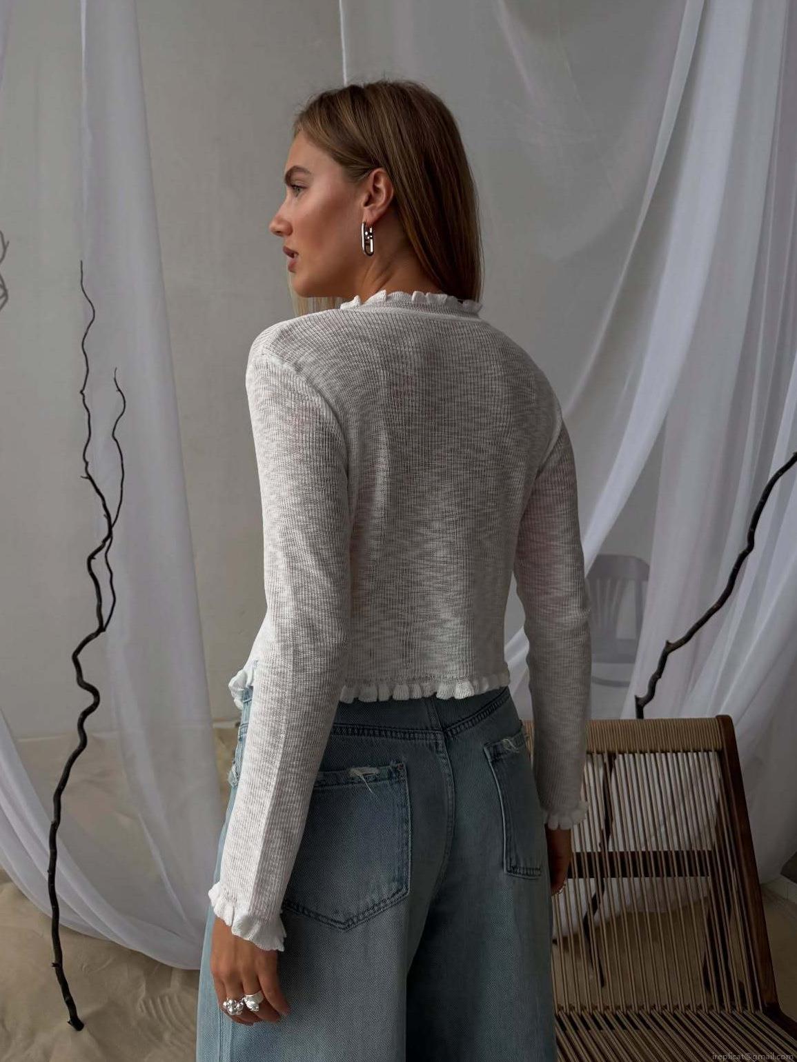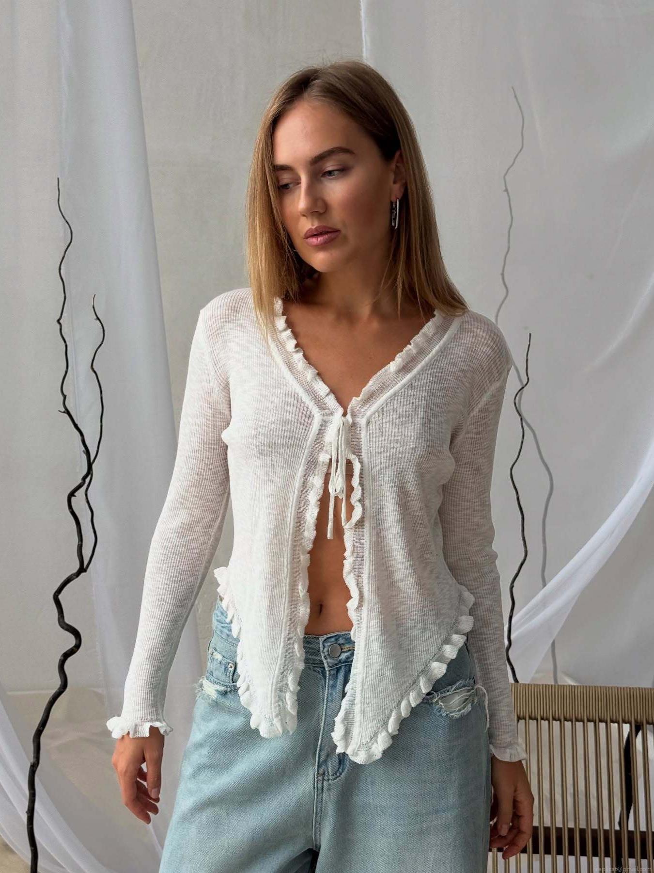 Women's Thin Knit Cardigan Sweater Ruffle Trim Tie Front Long Sleeve V Neck Viscose Blend Knitwear Elegant White Top Casual Outerwear