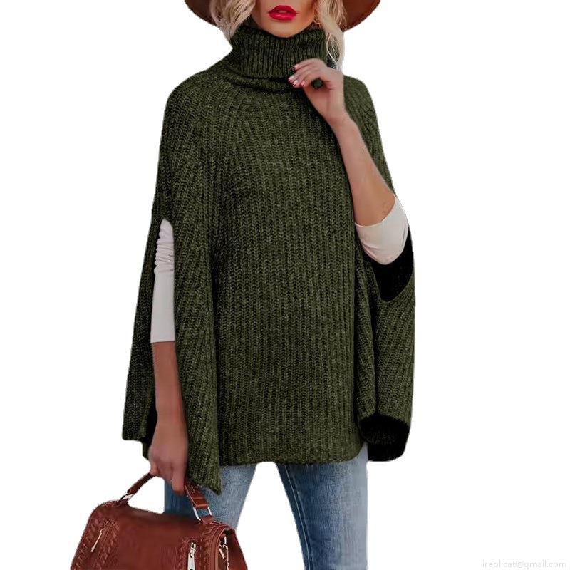 Solid Color, Side Fork, Turtleneck, Chunky Knit, Cloak Cut