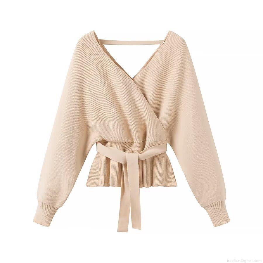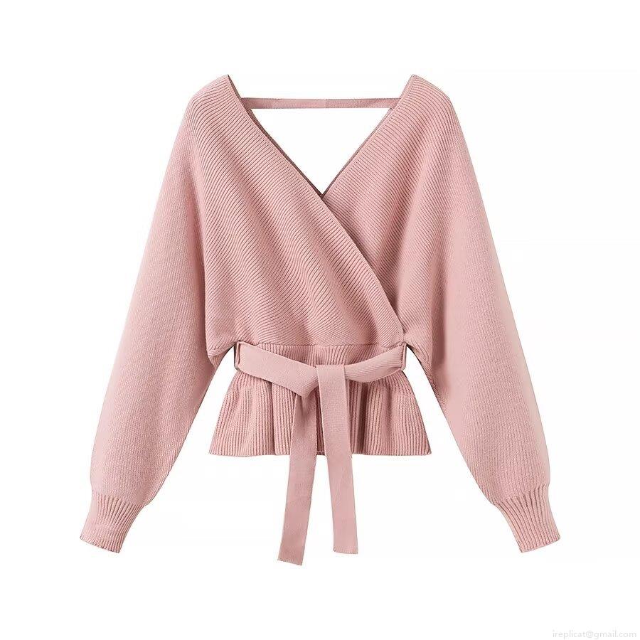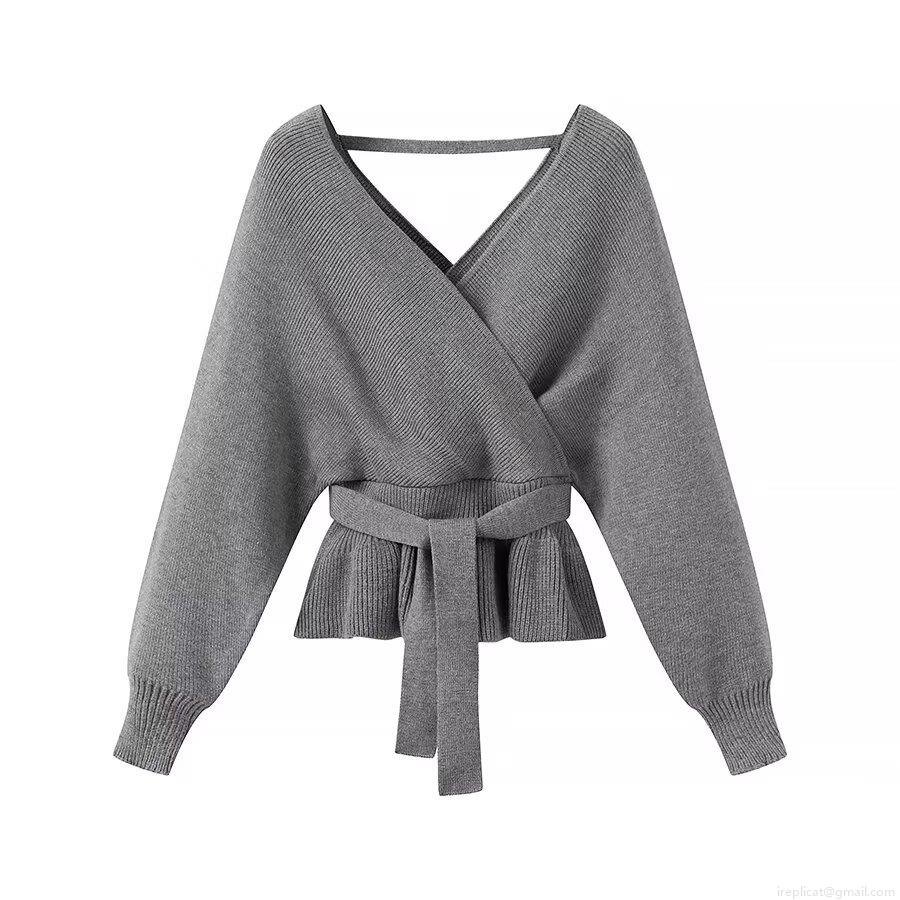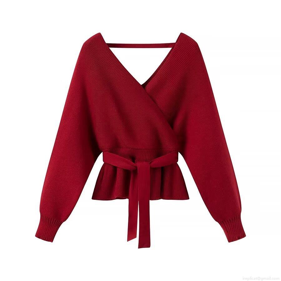 • Women's V Neck Cross Wrap Knit Sweater Tie-Up Waist Peplum Hem Long Sleeve Solid Ribbed Cardigan Top For Daily Party Streetwear Fashion Soft Polyester Knitted Pullover