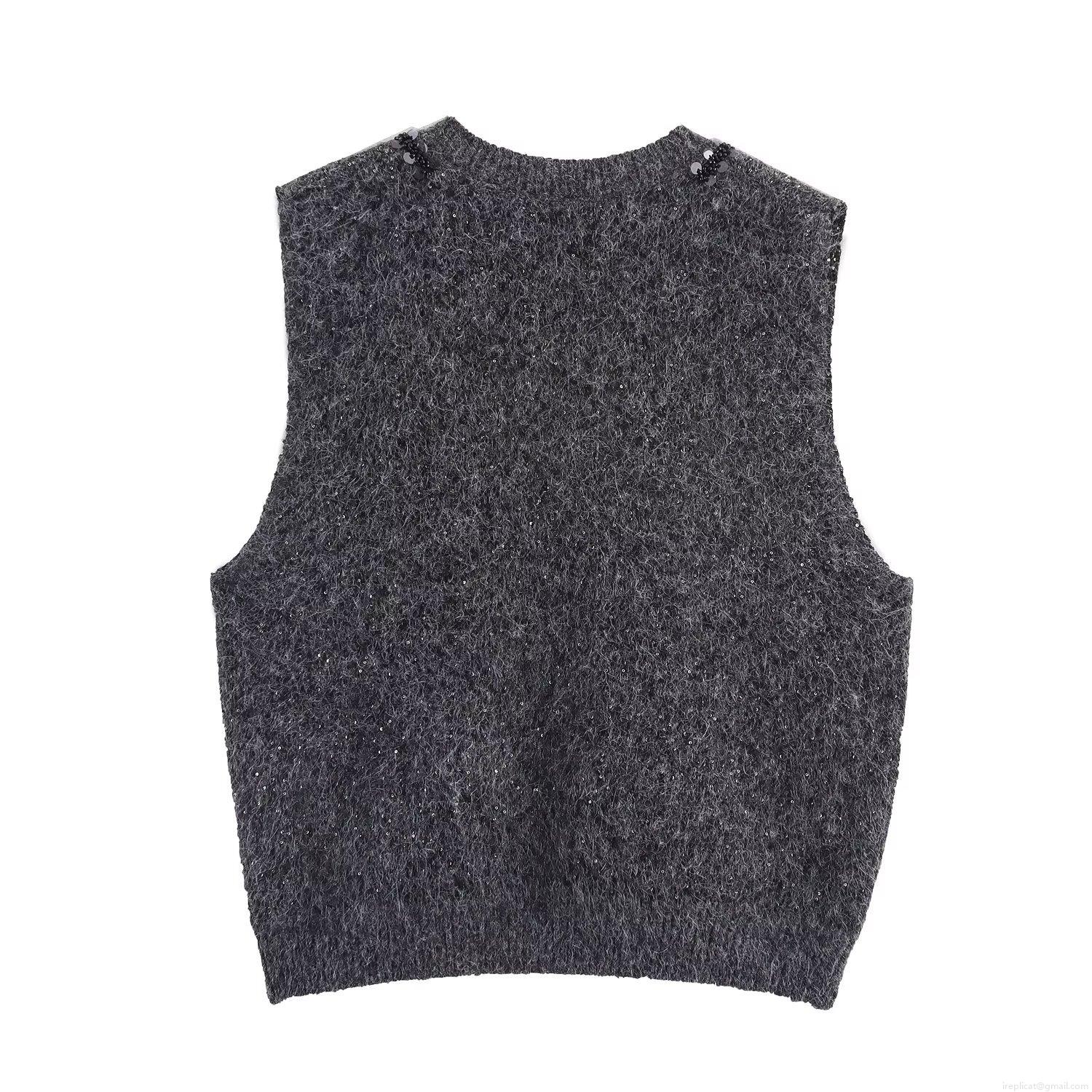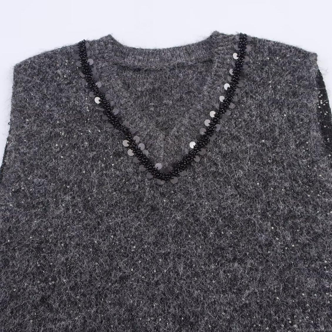 • Women's V Neck Knit Vest Sleeveless Sequin Trim Sweater Casual Solid Color Soft Knitwear Top For Summer Daily Wear