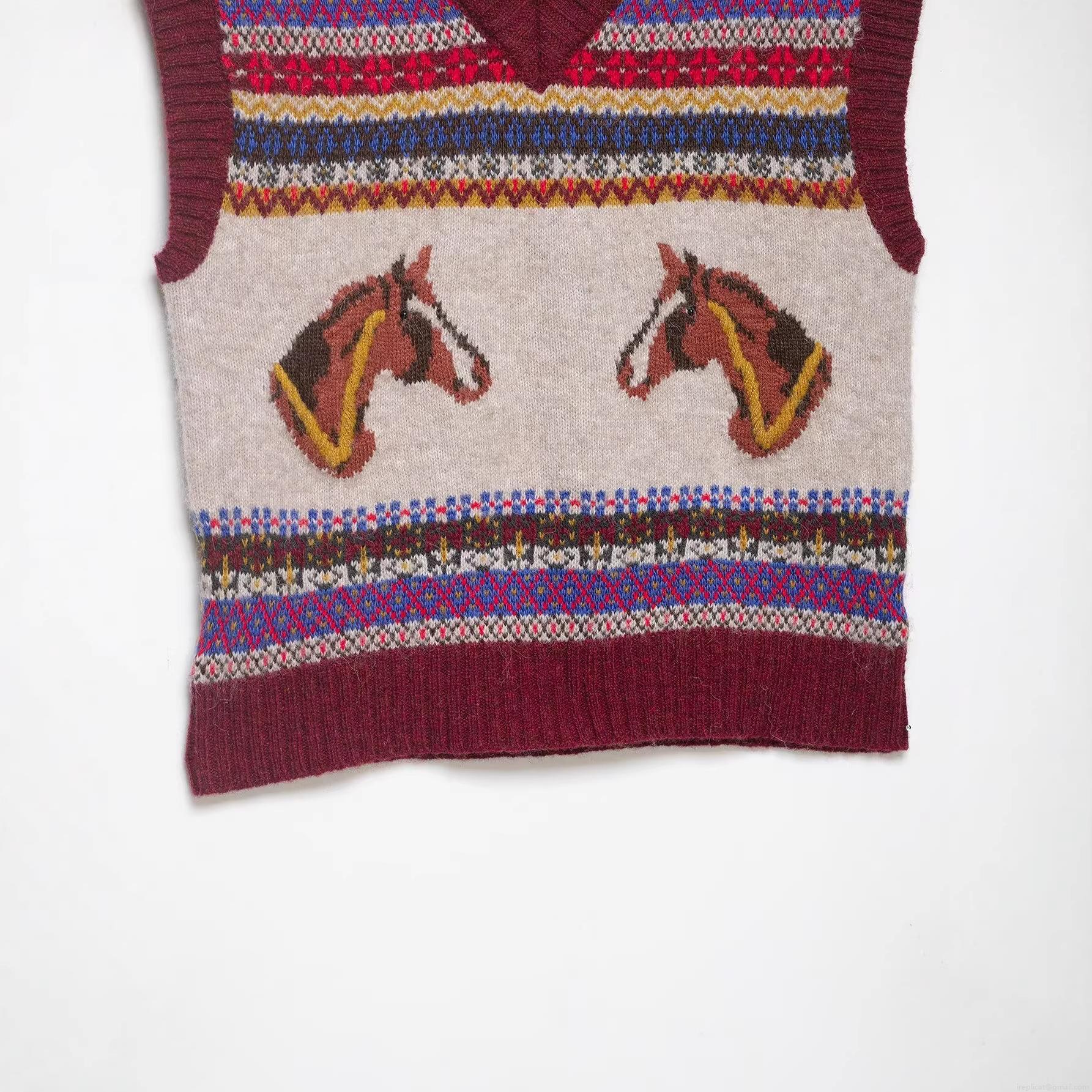 Women's Vintage Fair Isle Knit Sweater Vest Elegant V-Neck Sleeveless Horse Pattern Pullover Top 100% Polyester Knitted Waistcoat For Spring Autumn Daily Casual