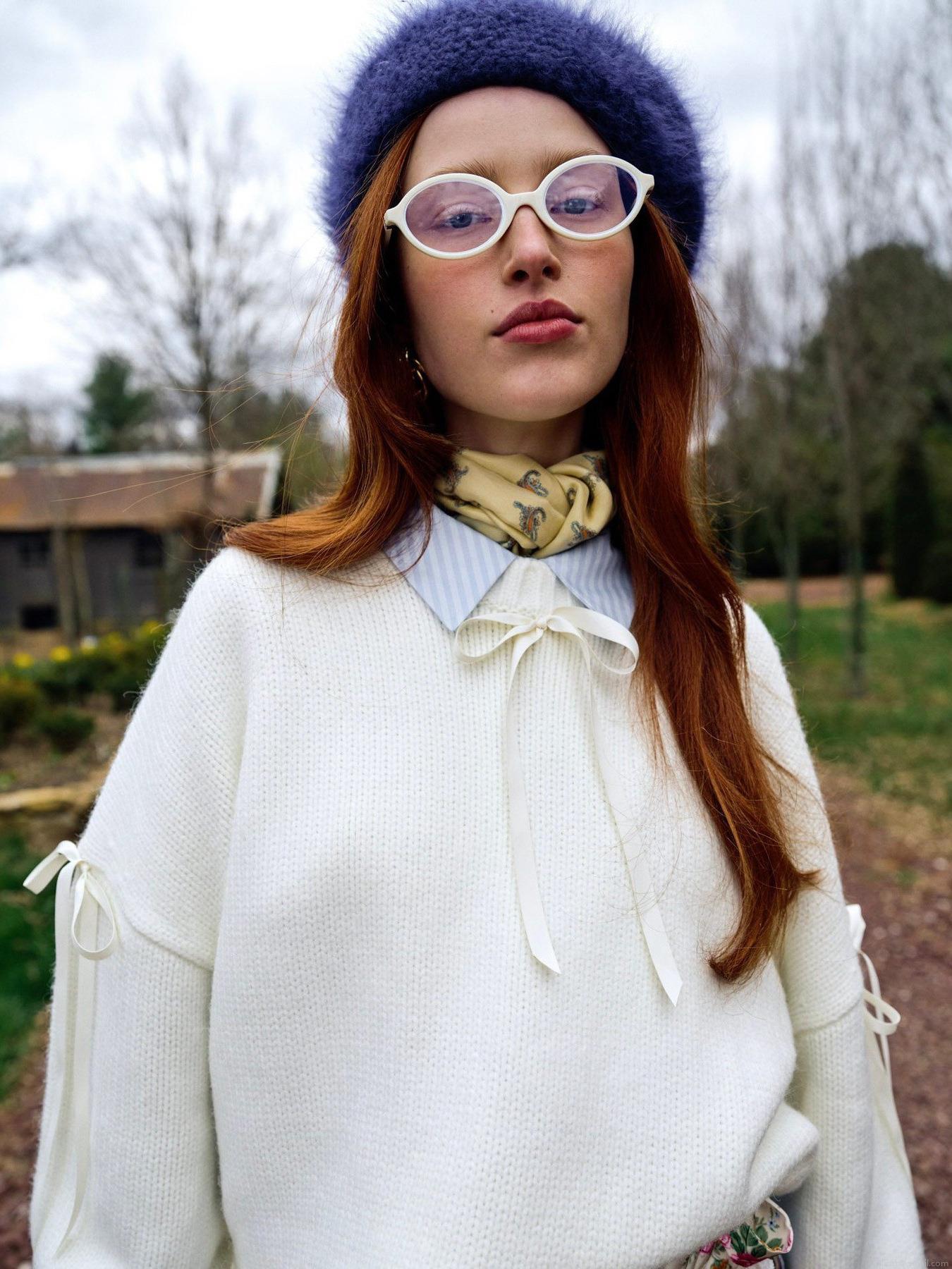 • Women's Vintage Sweet Bow Decor Knitted Sweater Cotton Blend Round Neck Long Sleeve Pullover Autumn Winter Casual Elegant Knitwear Tops