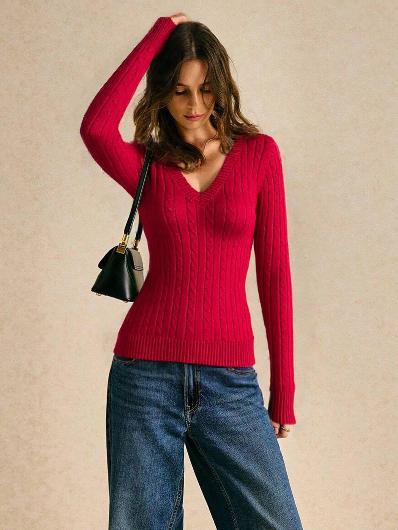 • Women's V-Neck Cable Knit Sweater Viscose Polyester Nylon Pullover Long Sleeve Slim Fit Knitting Top Elegant Solid Red Jumper For Autumn Winter Casual Wear