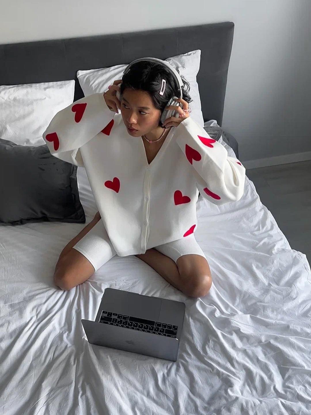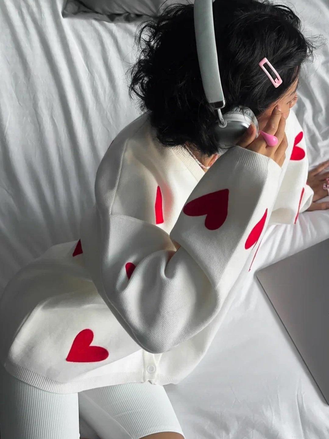 • Women's V-Neck Knit Cardigan Oversized Embroidered Heart Pattern Button Up Sweater Cotton Blend Long Sleeve Loose Outerwear For Casual Chic Streetwear