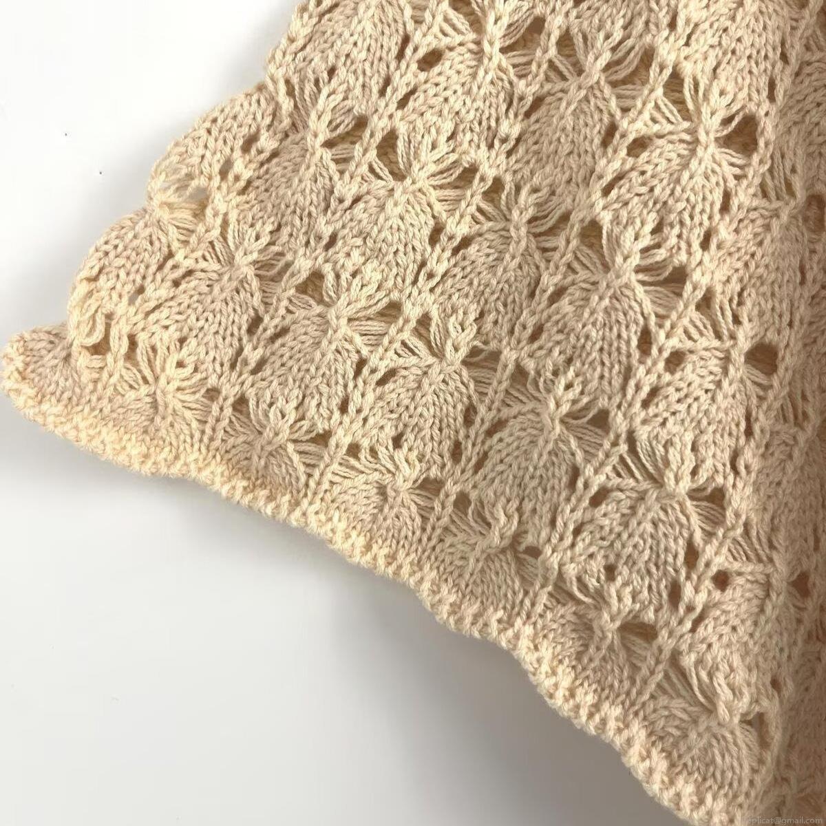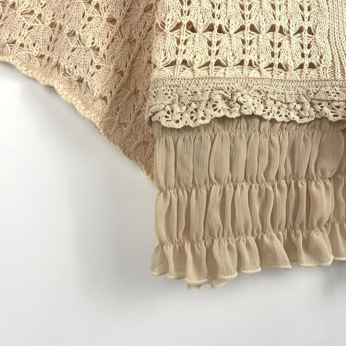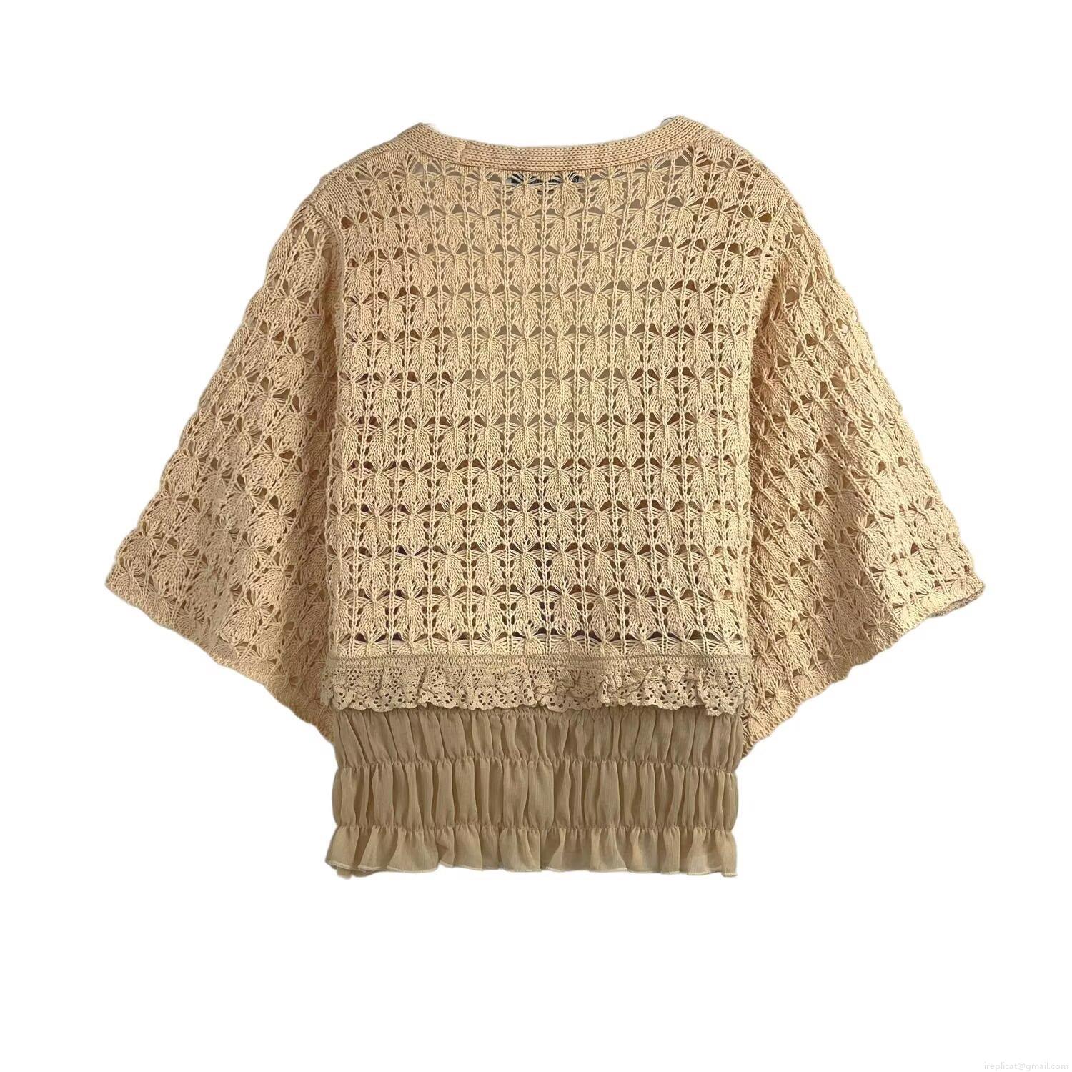 • Women's V-Neck Knit Cardigan Short Sleeve Crochet Hollow Out Lace Patchwork Tie-Up Apricot Top Casual Bohemian Style Cotton Blend Sweater
