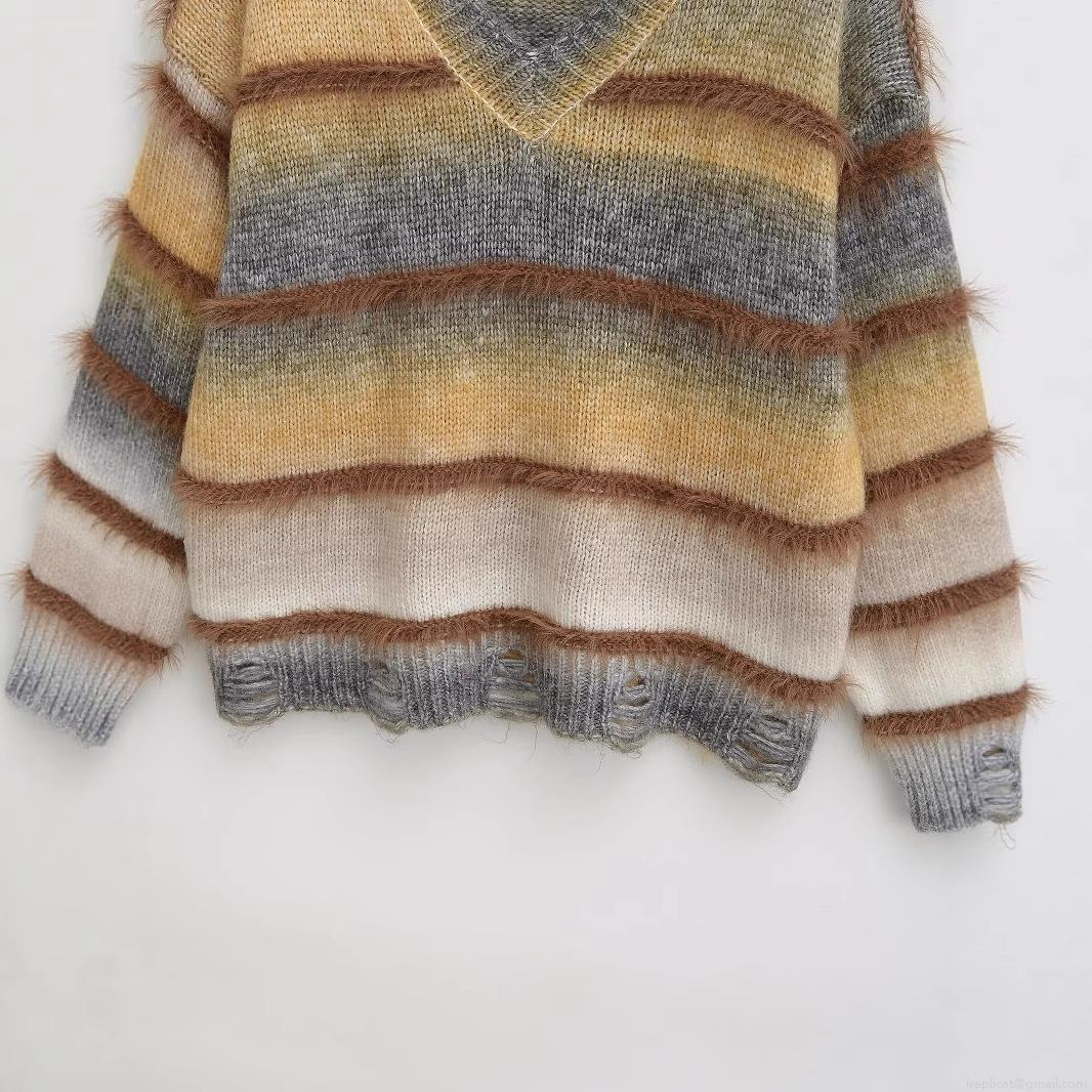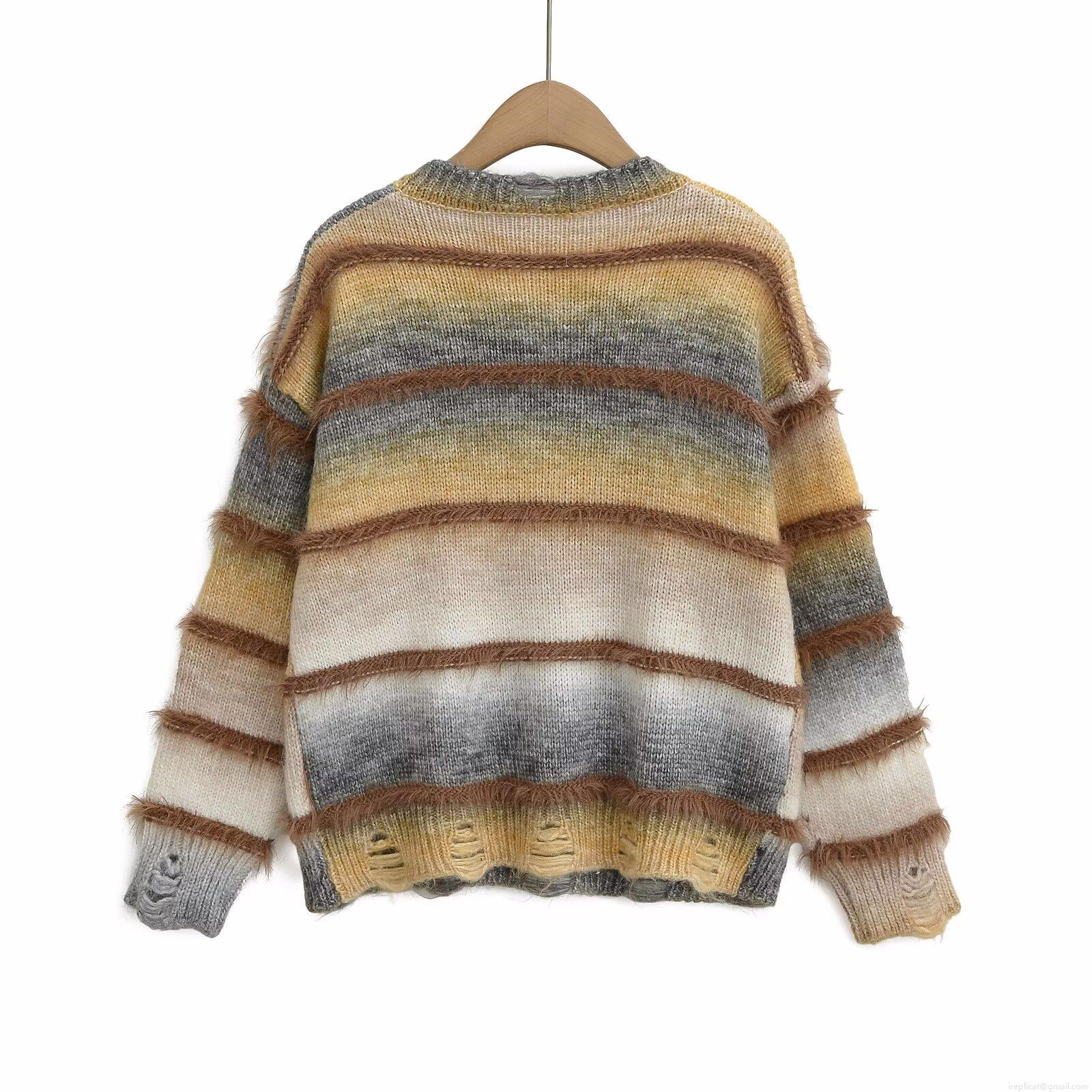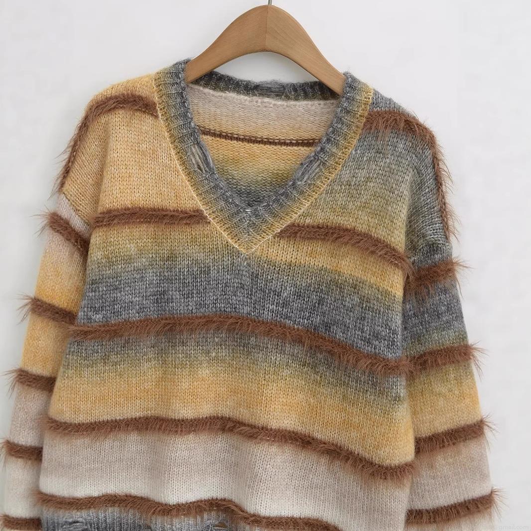 • Women's V-Neck Knit Sweater Gradient Striped Distressed Ripped Shaggy Fringe Long Sleeve Oversized Lazy Style Casual Pullover Jumper Knitwear