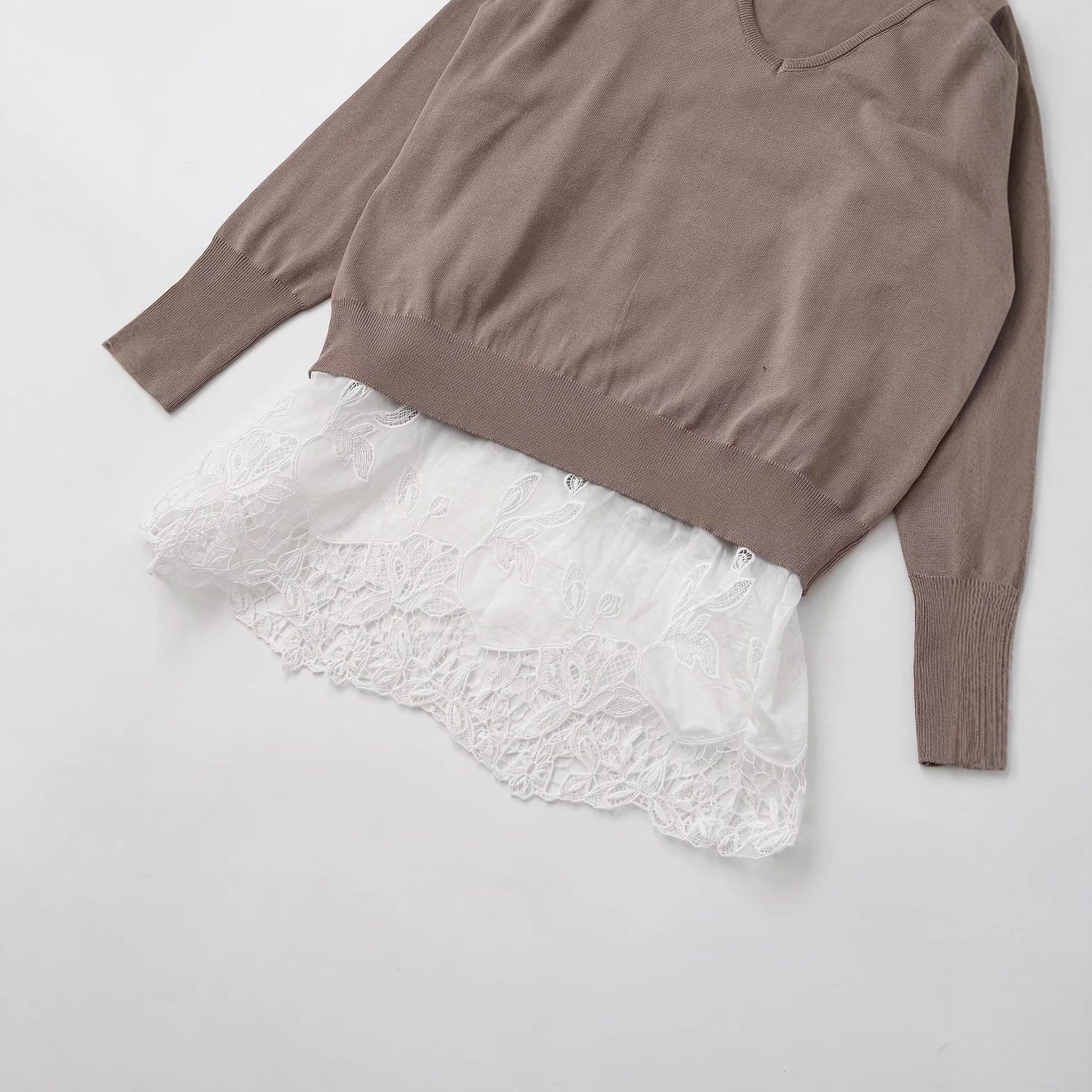 Women's V-Neck Long Sleeve Sweater Lace Patchwork Hem Loose Knit Top Autumn Winter Solid Pullover Streetwear Casual Ladies Jumper