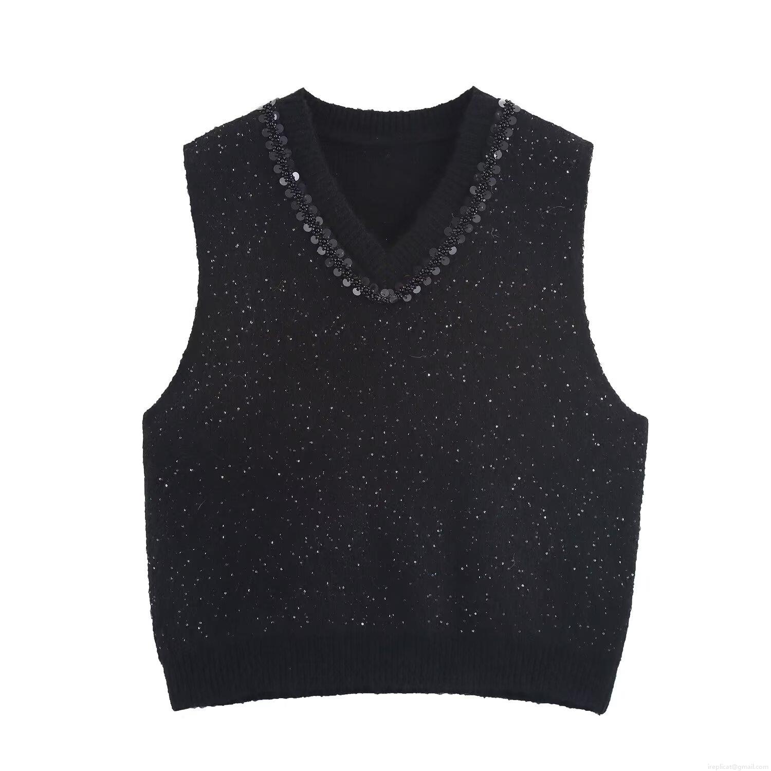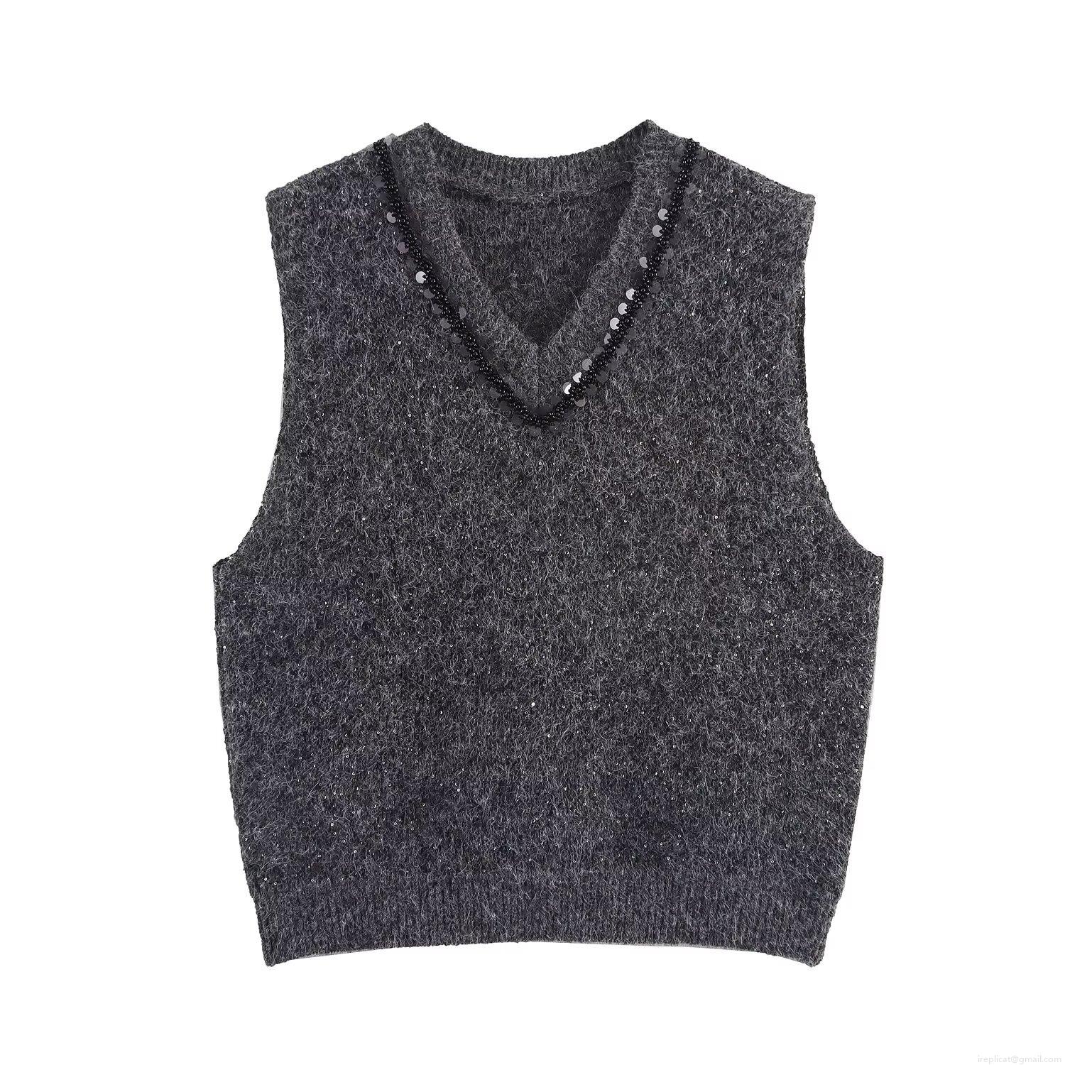 • Women's V-Neck Sleeveless Knitted Vest With Sequin Bead Trim Polyester Knit Sweater Tank Top Casual Streetwear Pullover For Autumn Winter