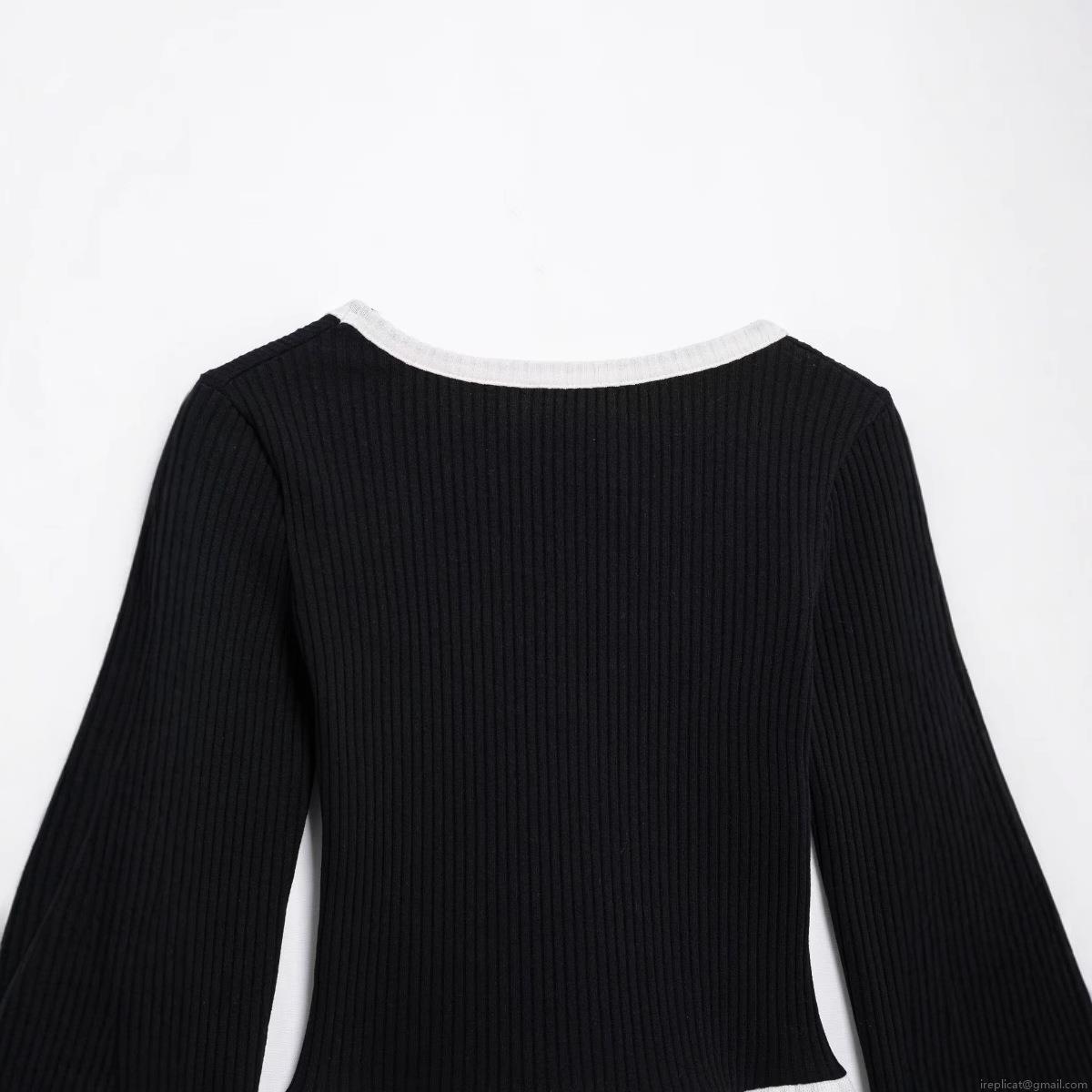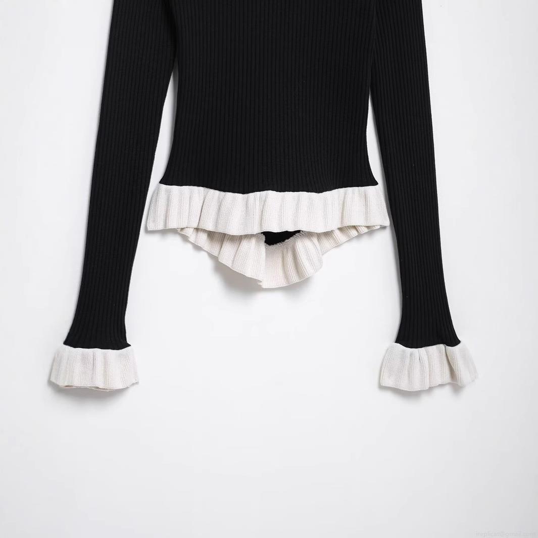 • Women's V-Neck Slim Fit Knitted Sweater Polyester Ribbed Contrast Color Lettuce Trim Long Sleeve Pullover Short Top Streetwear