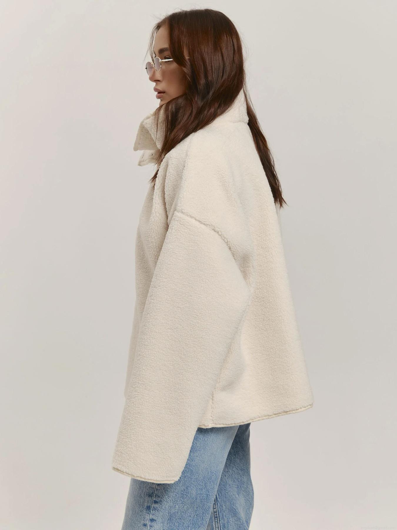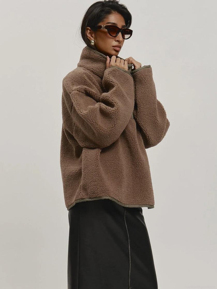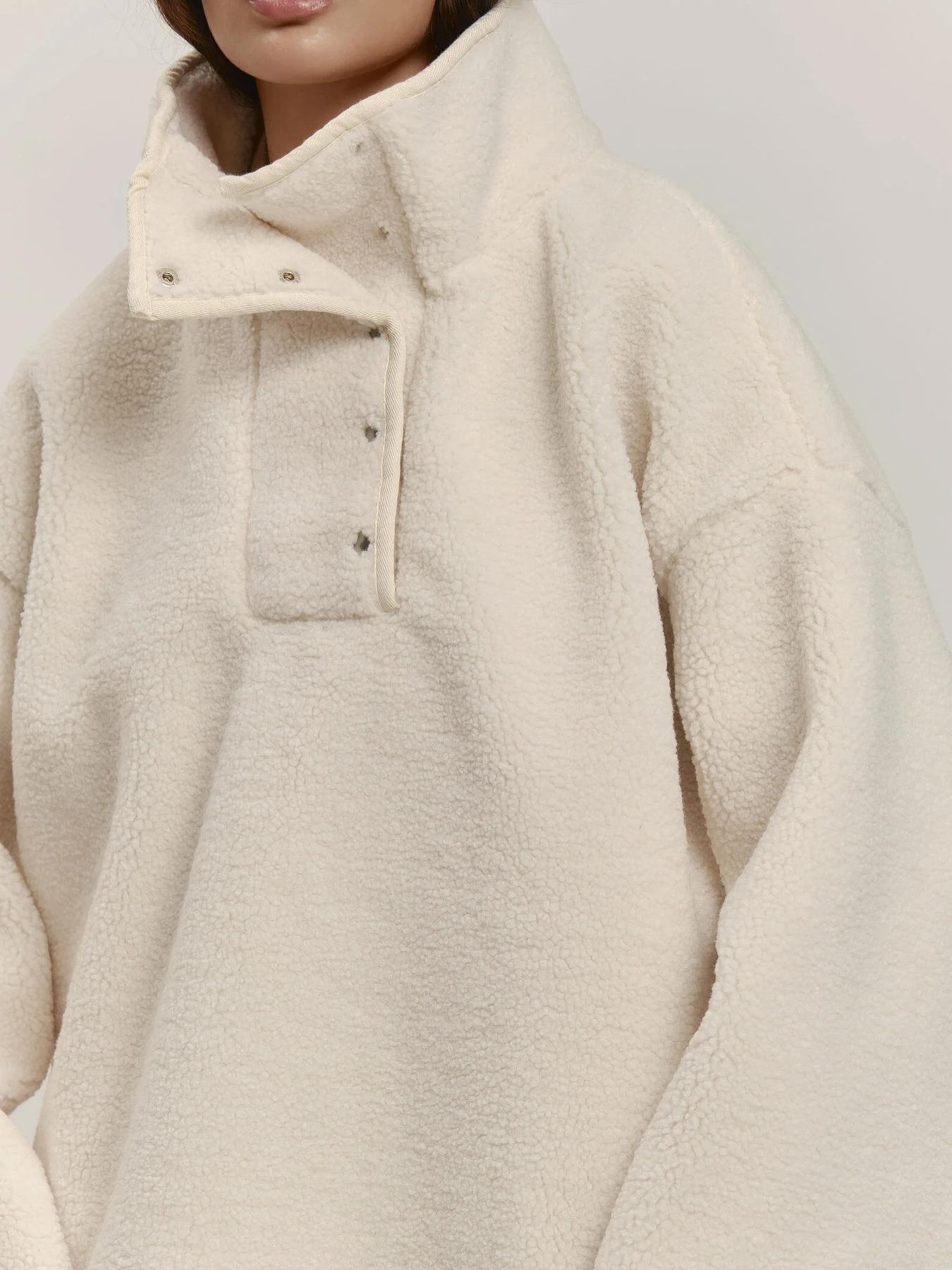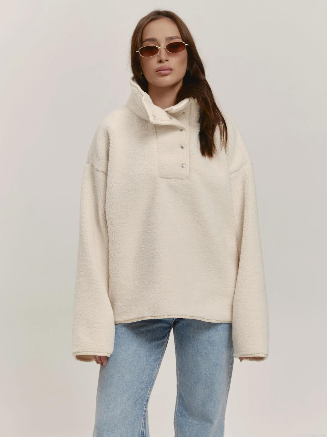 • Women Oversized Sherpa Fleece Pullover High Neck Stand Collar Sweatshirt With Buttons Long Sleeve Solid Color Warm Heavyweight Autumn Winter Streetwear Top