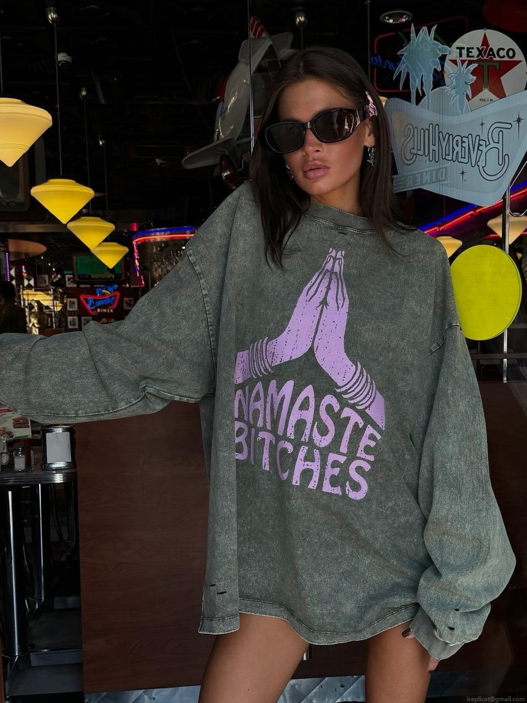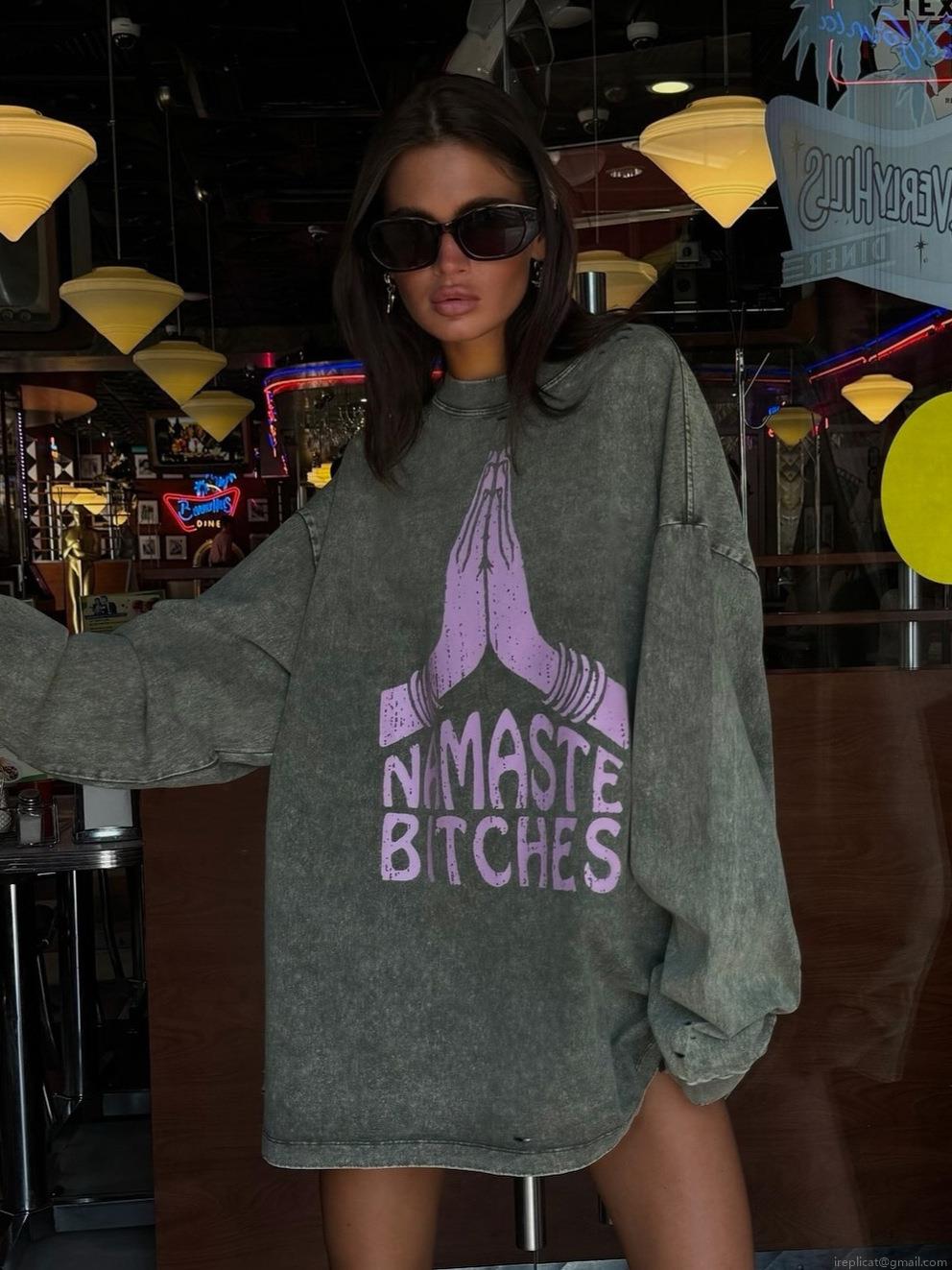 Women's Acid Wash Oversized Sweatshirt American Vintage Print Cotton Long Sleeve Pullover Namaste Bitches Streetwear Autumn Loose Top