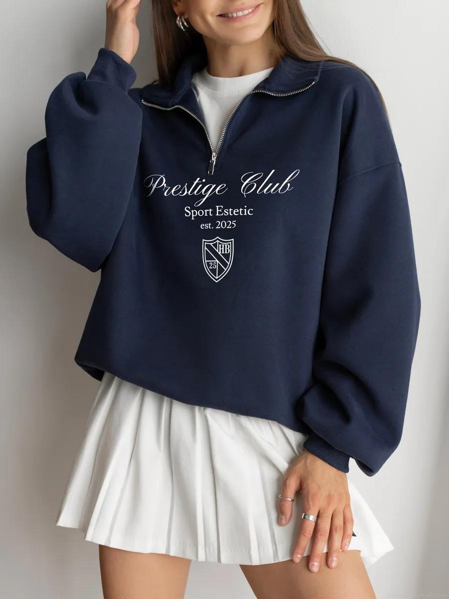 Letters, Half Zipper, Printing, Stand-up Collar, Dropped Shoulder Sleeves, Shield Stamp