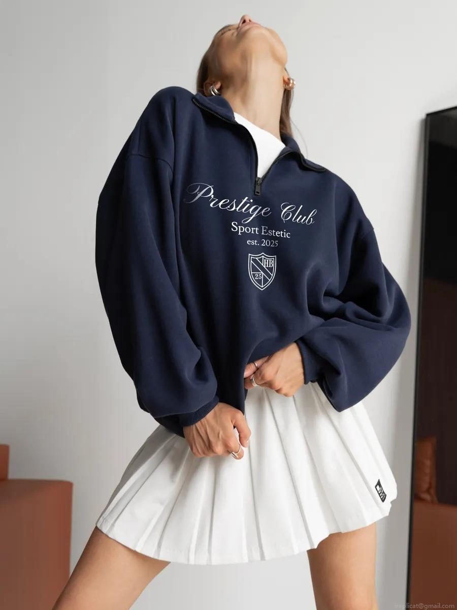 Women's American Vintage 100% Cotton Half-Zipper Sweatshirt Loose Long Sleeve Printed Stand Collar Pullover Jacket Casual Streetwear Fashion Top