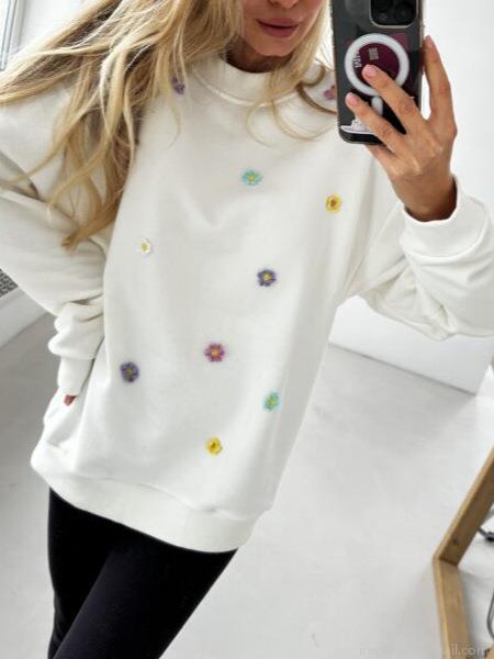 • Women's Cotton Sweatshirt 3D Handmade Crochet Flower Decoration Loose Fit Round Neck Long Sleeve Pullover Top Casual Streetwear